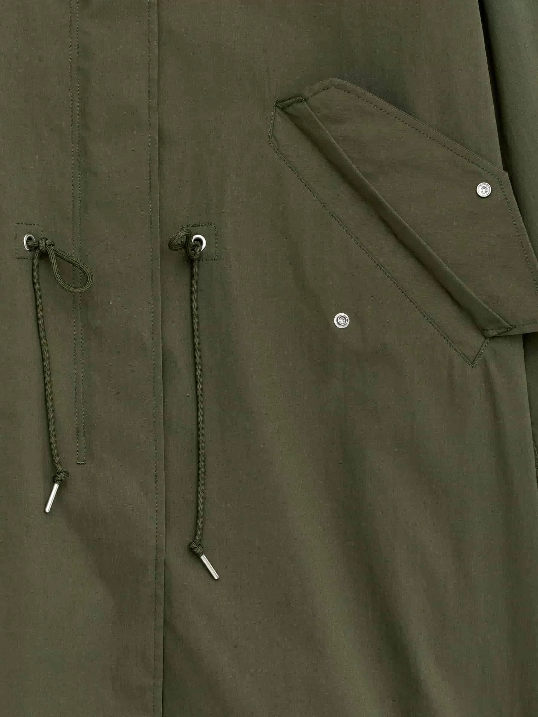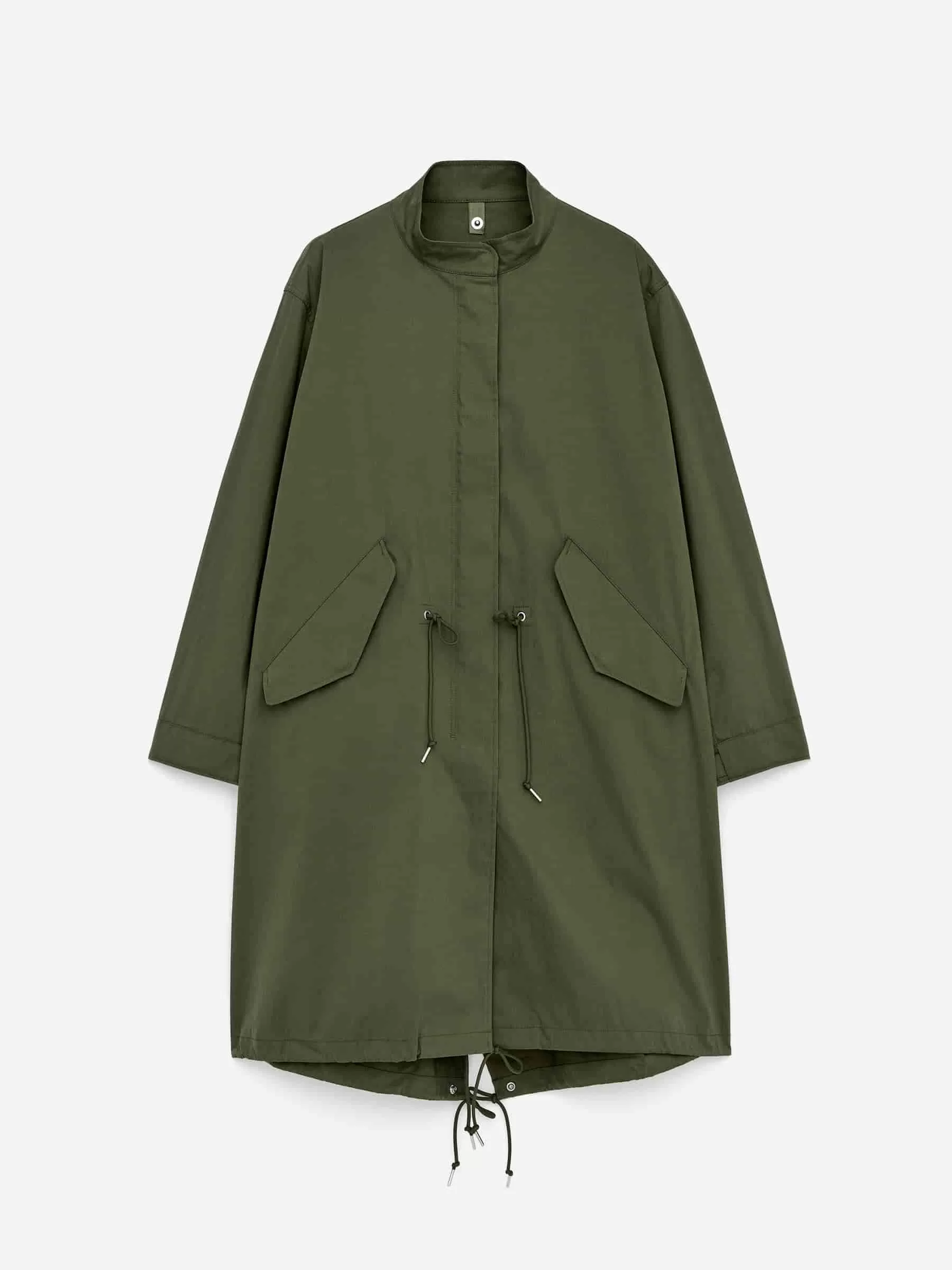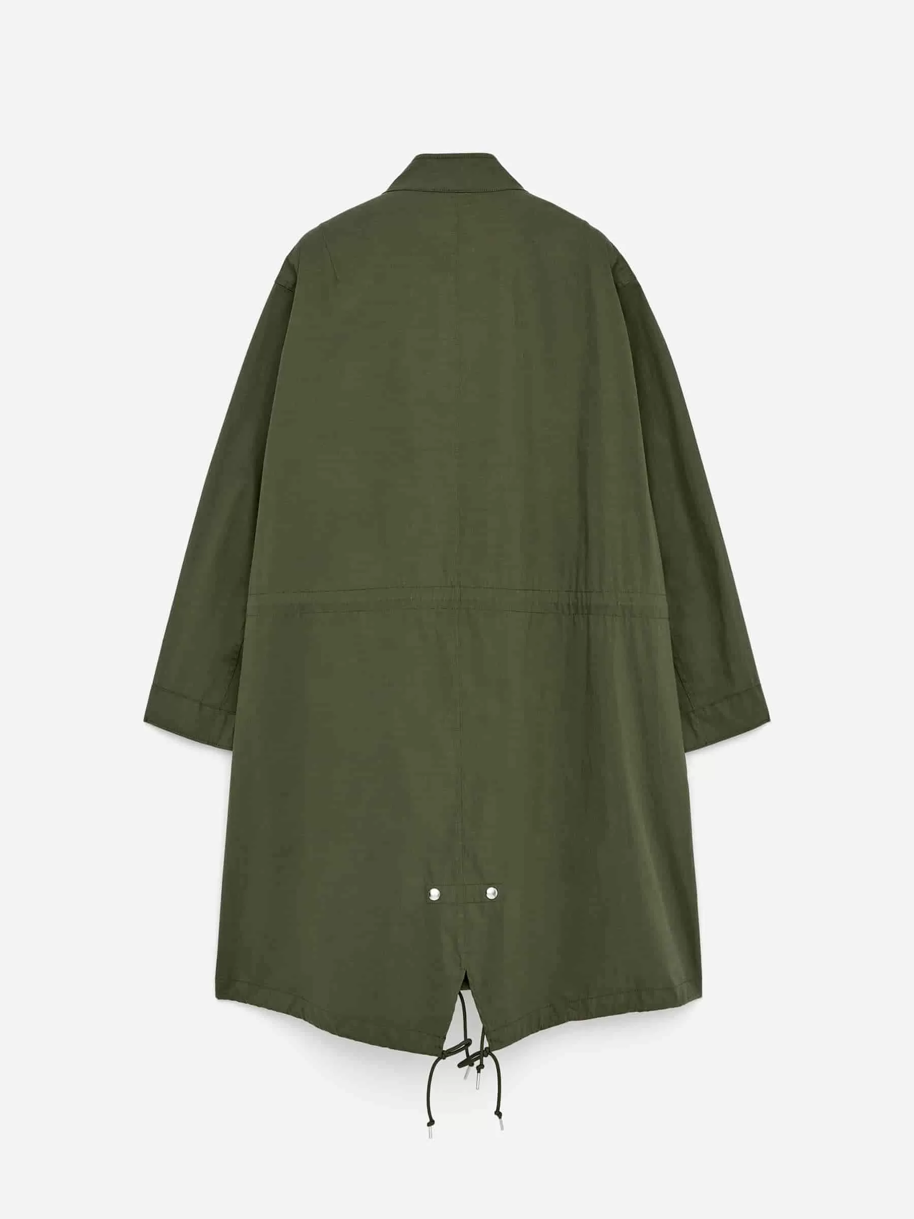 Parka sin forro con cuello alto. Detallado con tapeta frontal con botones a presión ocultos y cremallera metálica. Grandes bolsillos inclinados con solapa y cordón en la cintura y en el bajo. Lengüetas ajustables en las mangas.