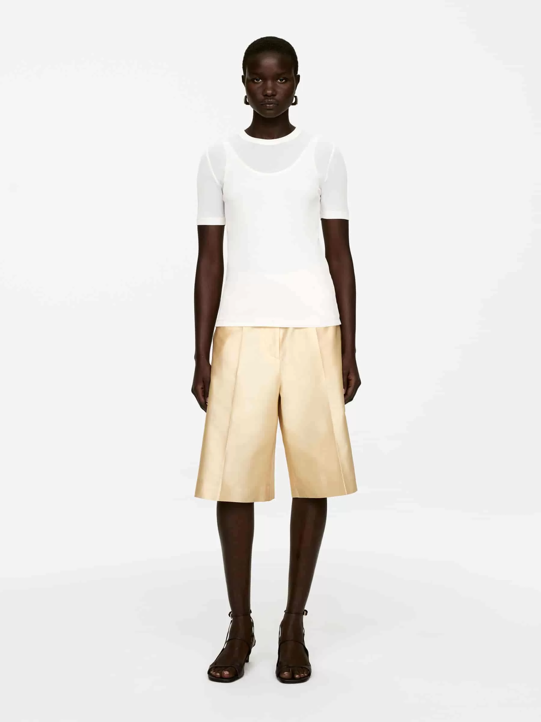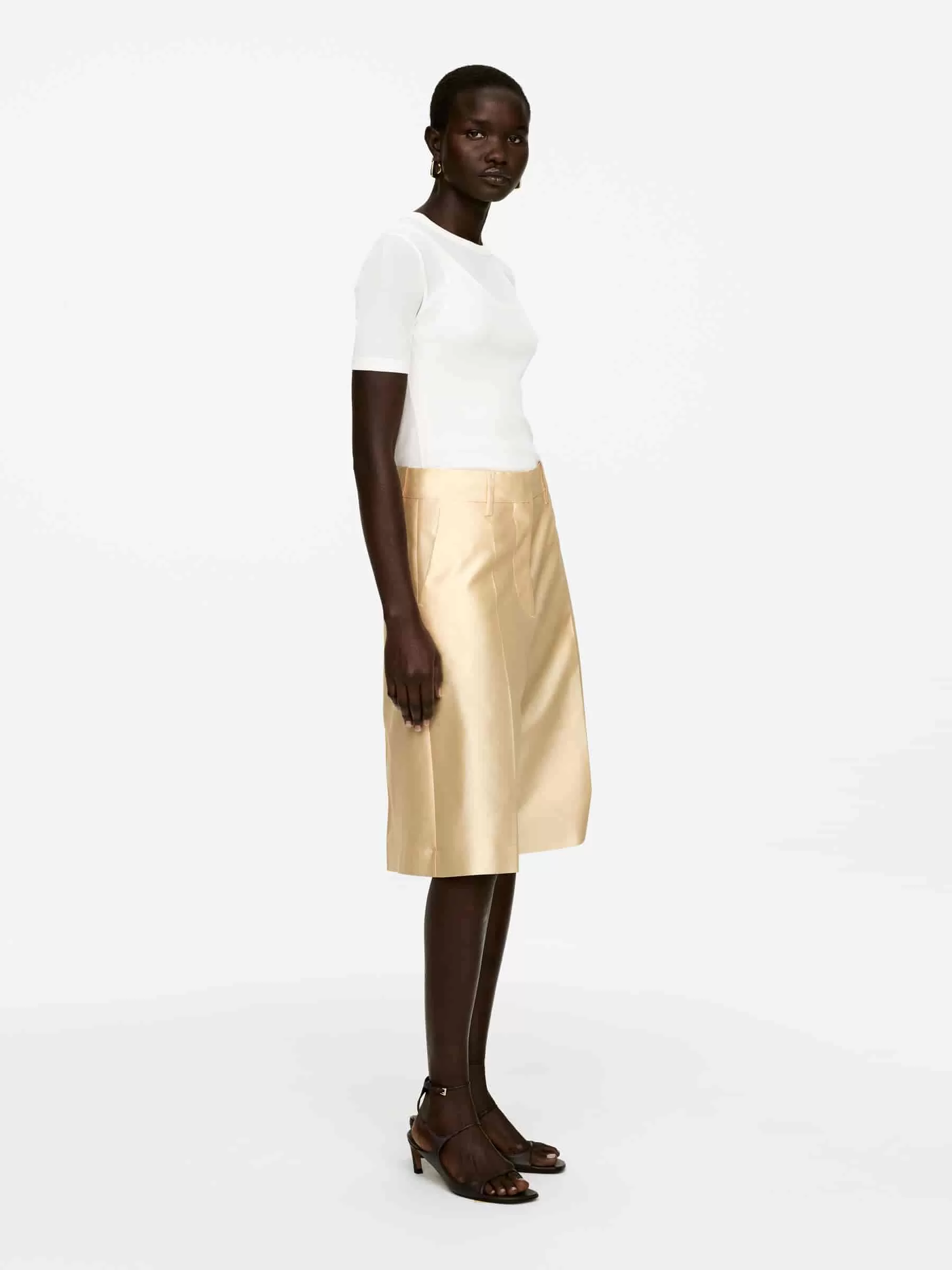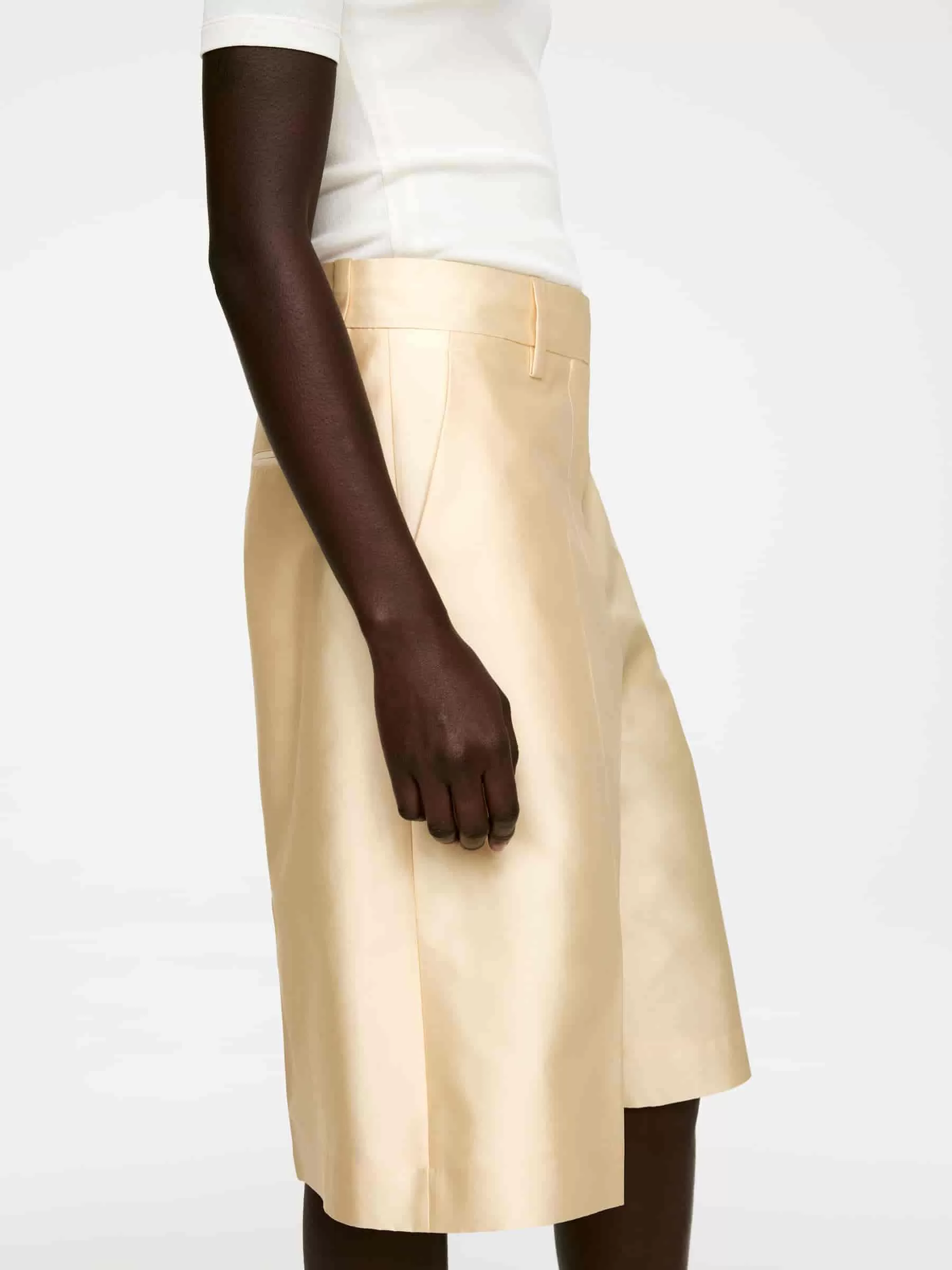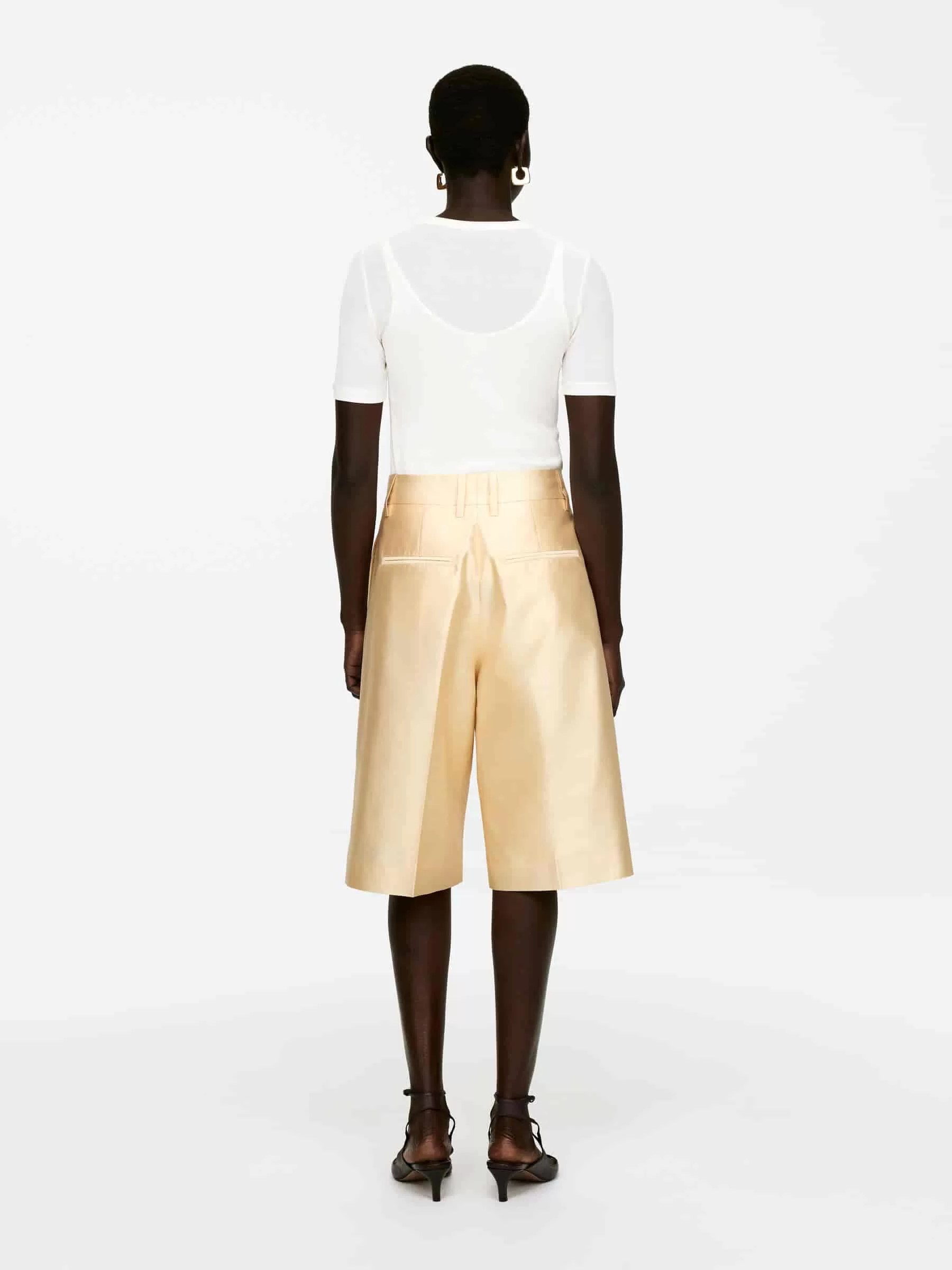 Shorts hasta la rodilla confeccionados en una mezcla de poliéster y seda de morera. Diseñado con pliegues a presión, cintura de talle medio, bolsillos laterales inclinados y bolsillos traseros con doble ribete. Cierre de corchetes y bragueta con cremallera.