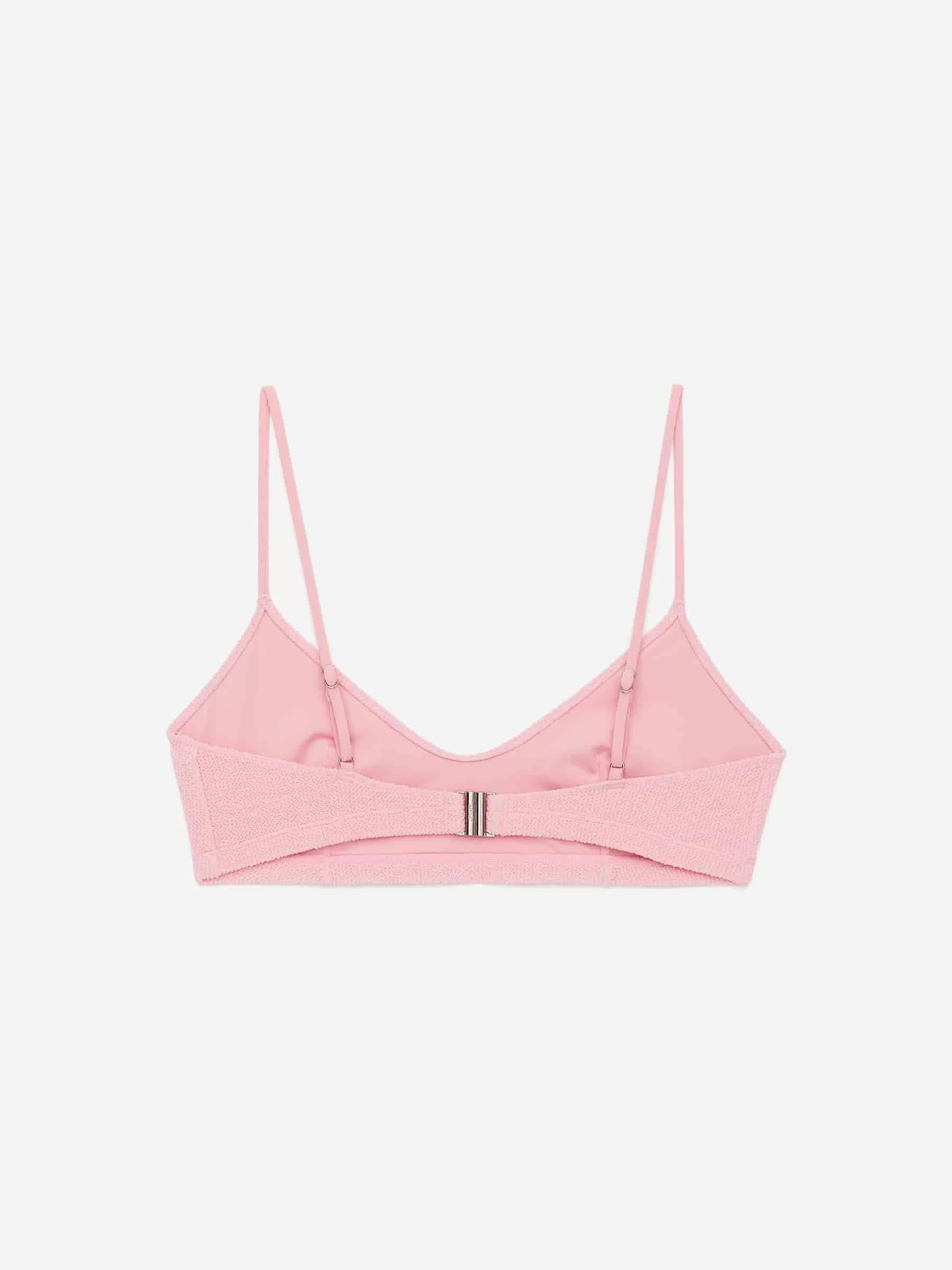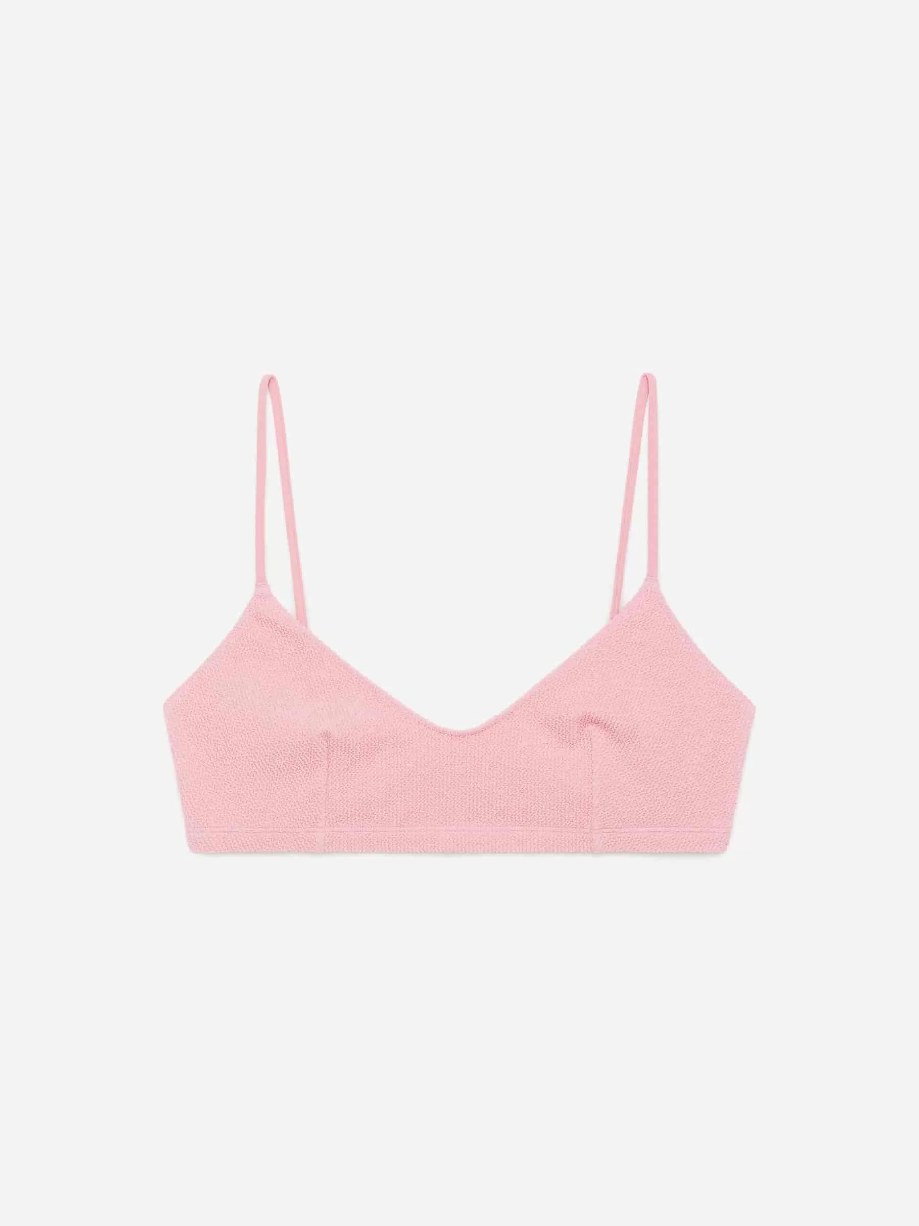 Top de bikini con superficie arrugada confeccionado con un tejido de punto elástico. Un modelo suave y sin acolchado diseñado con tirantes finos y ajustables. Pinzas cosidas en las copas para una buena forma. Soporte ligero. Forrado al frente.