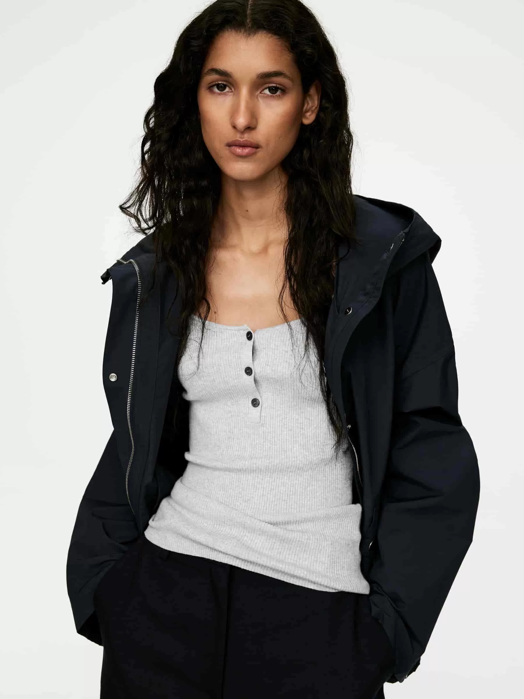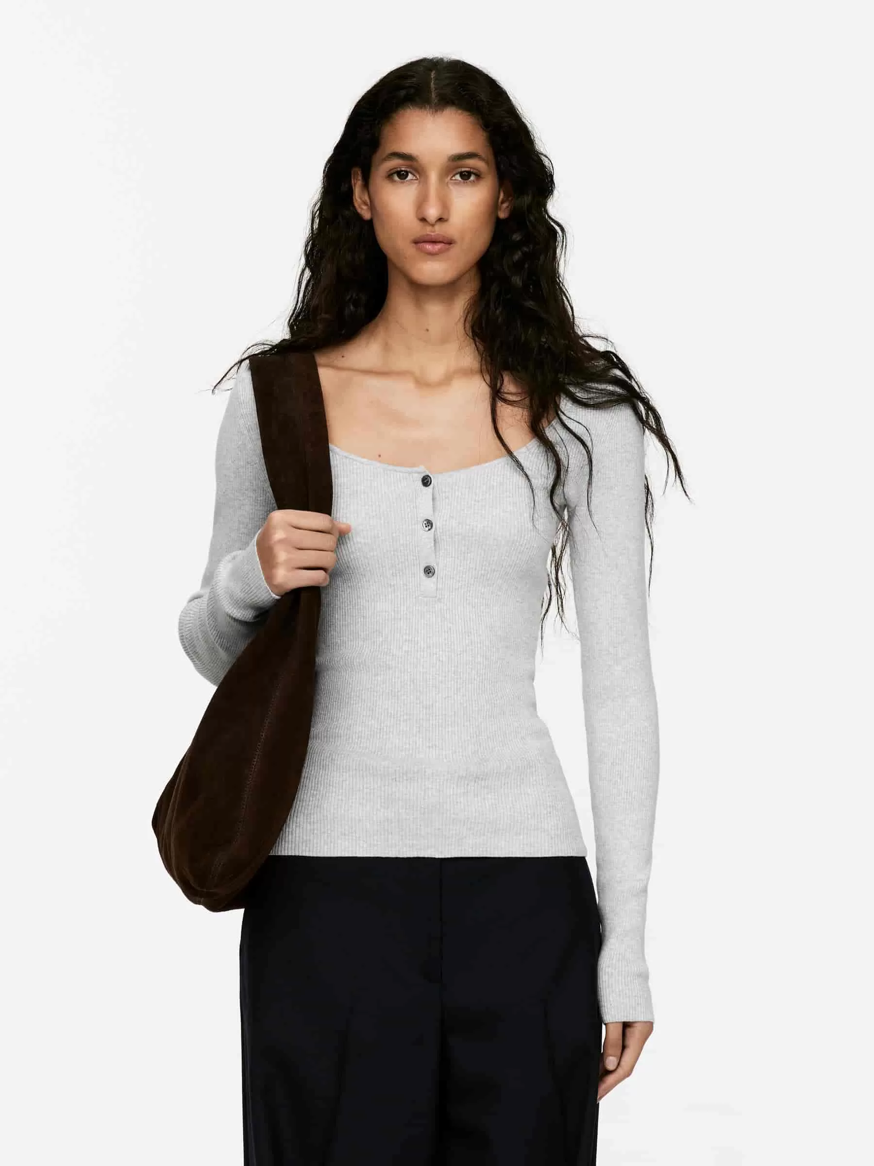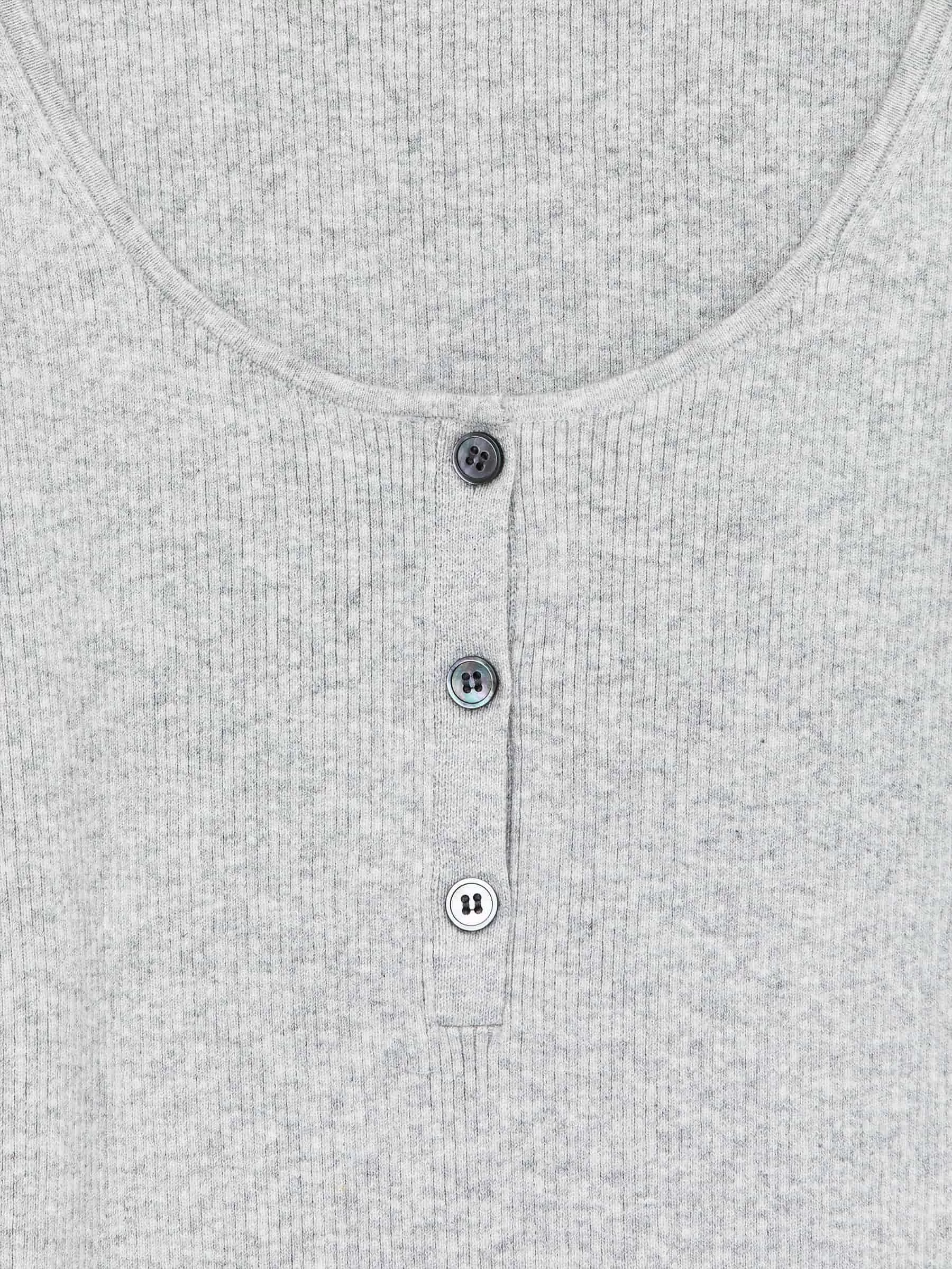 Top en punto de canalé con escote bailarina y cierre de botones. Corte ajustado.