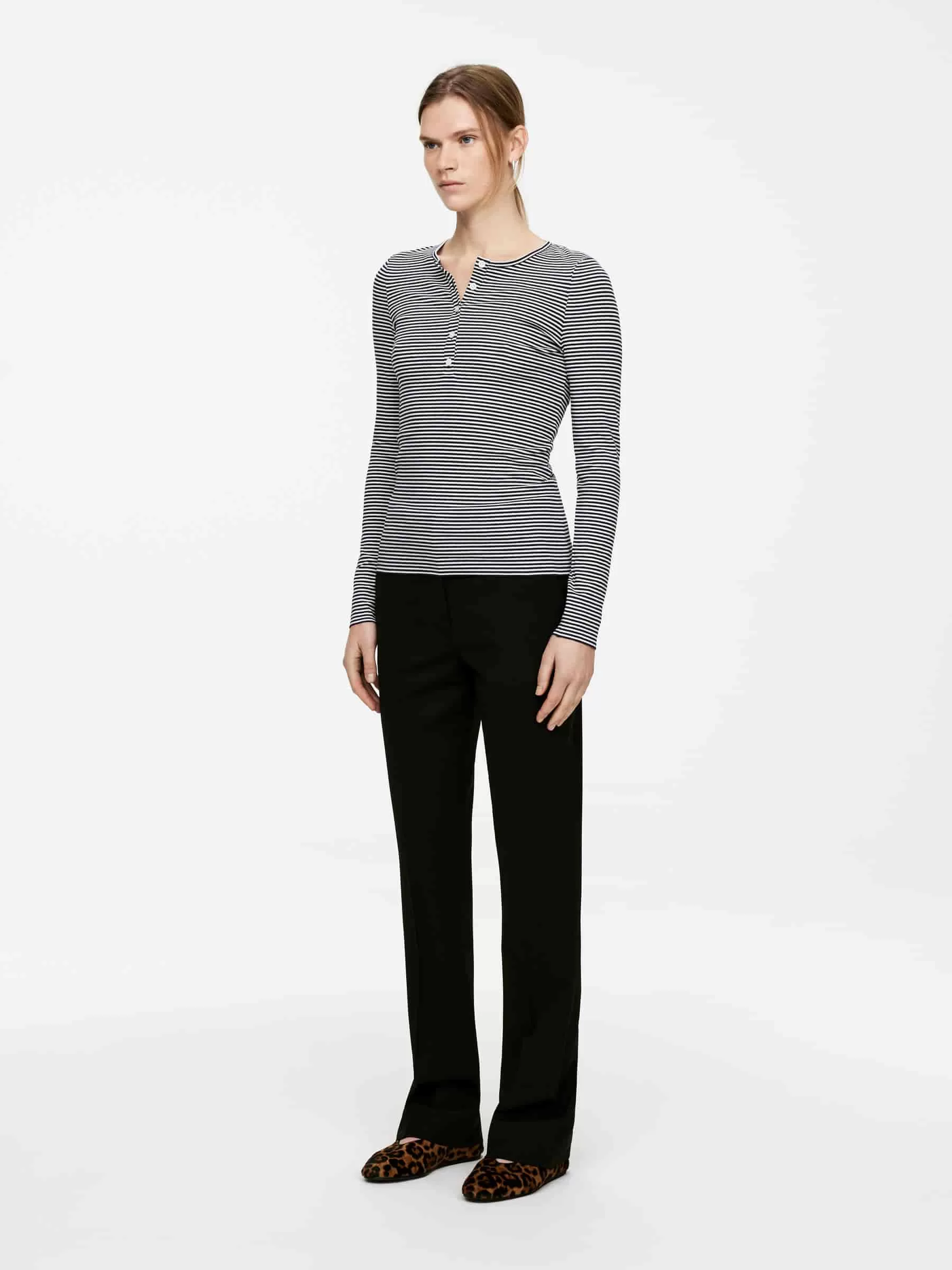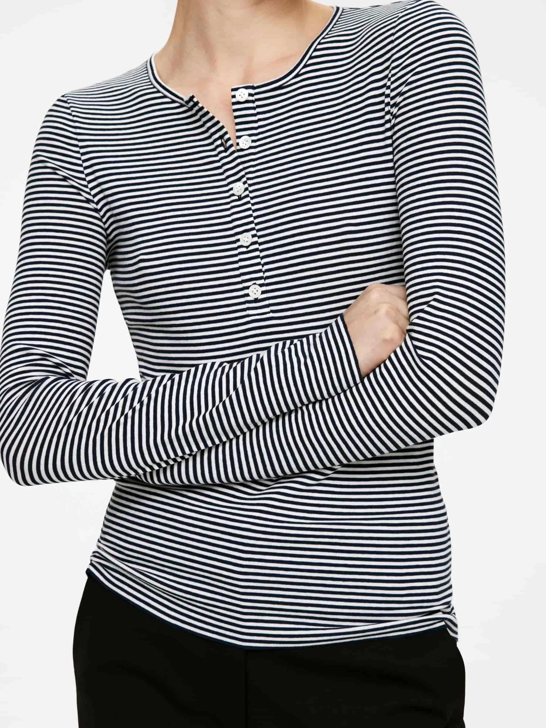 Top de manga larga confeccionado en un punto semitransparente con textura acanalada. Un estilo henley entallado con escote redondo y botones delicados.