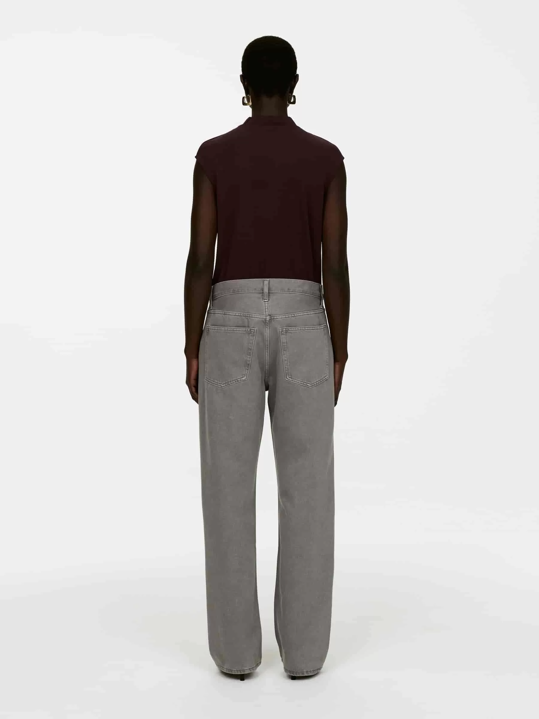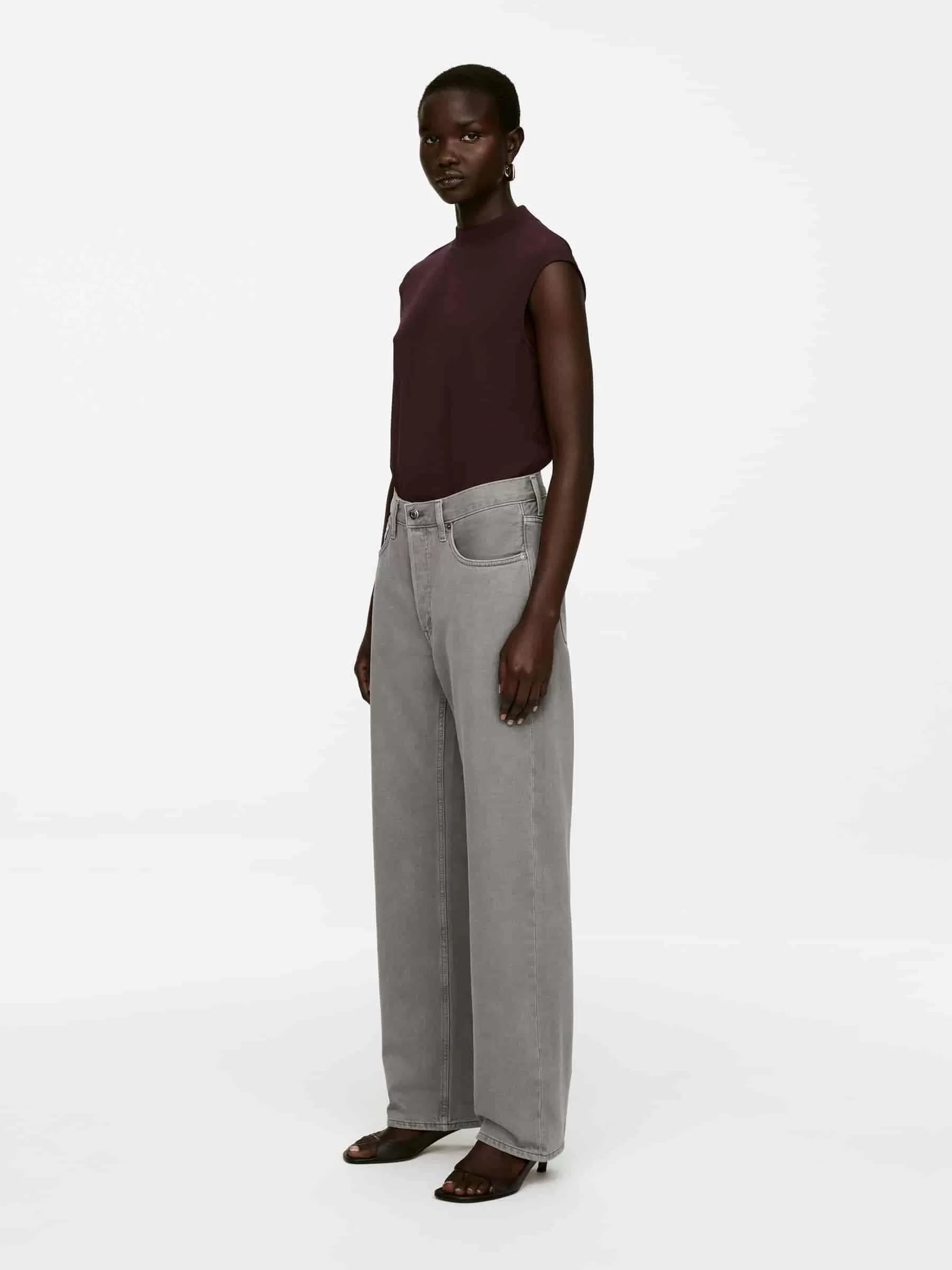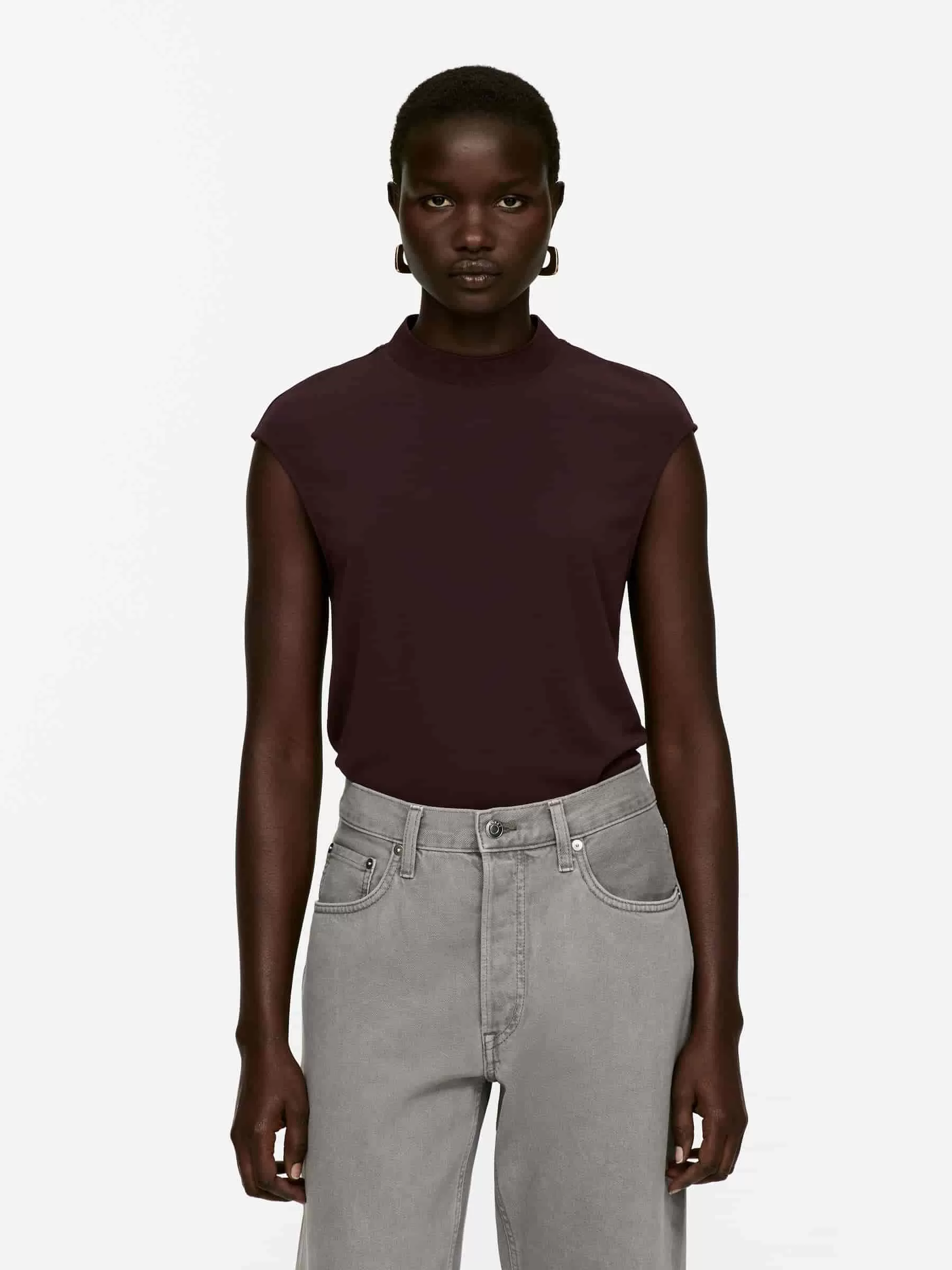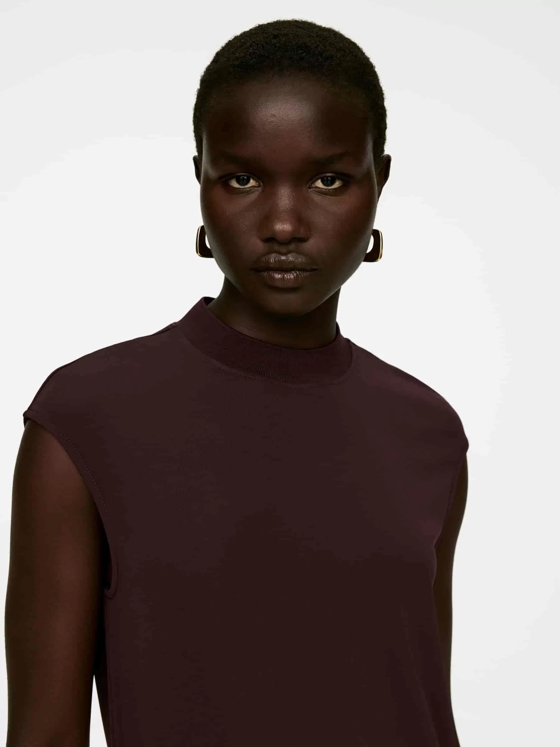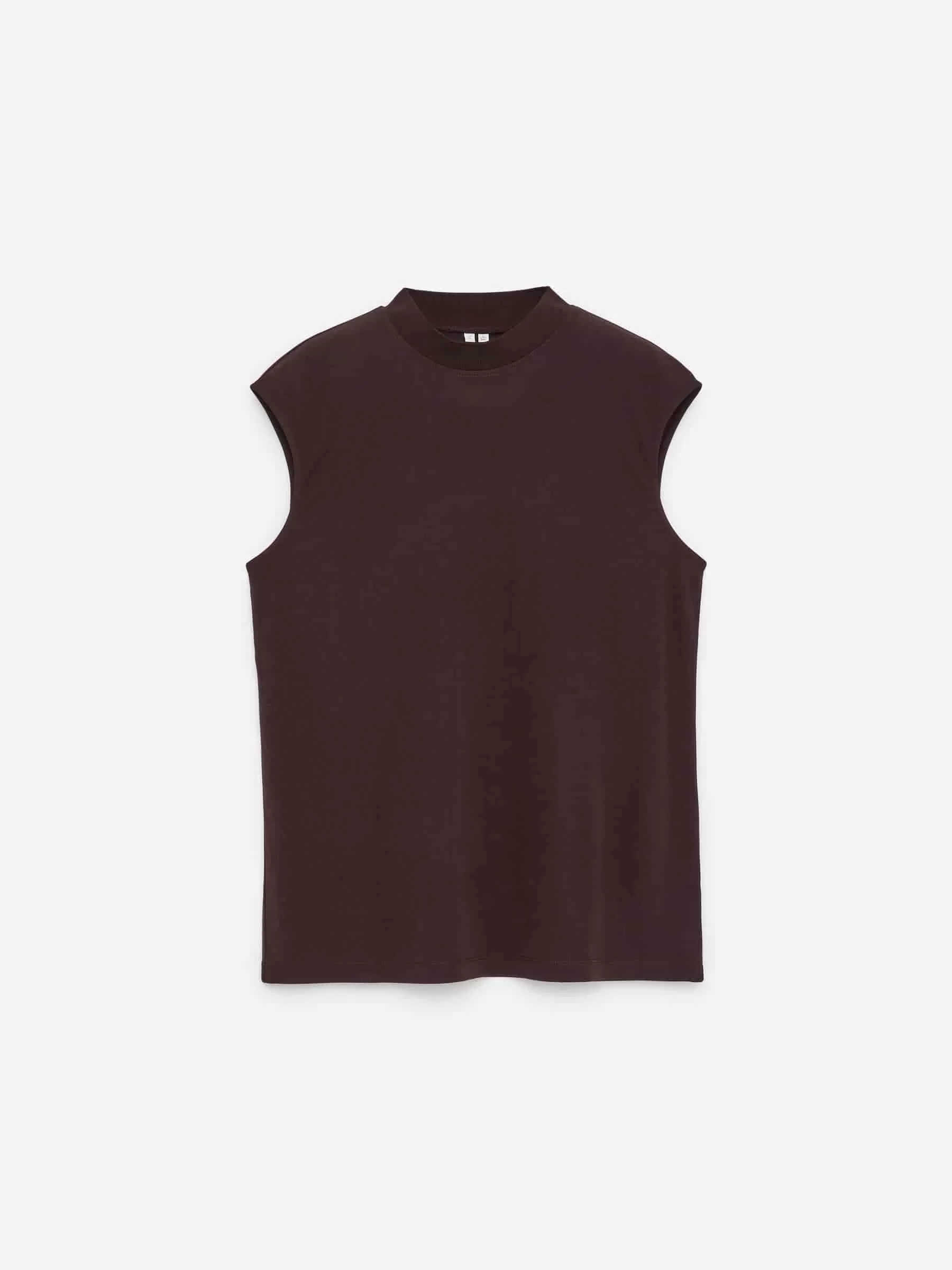 Top sin mangas confeccionado en un fluido tejido de punto interlock de crepé. Este estilo presenta un cuello alto de canalé y una silueta moldeada en la cintura. Parte del conjunto.