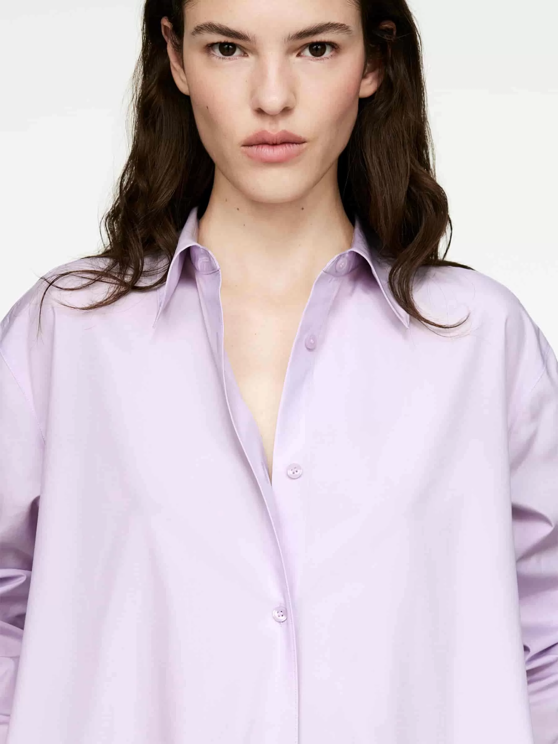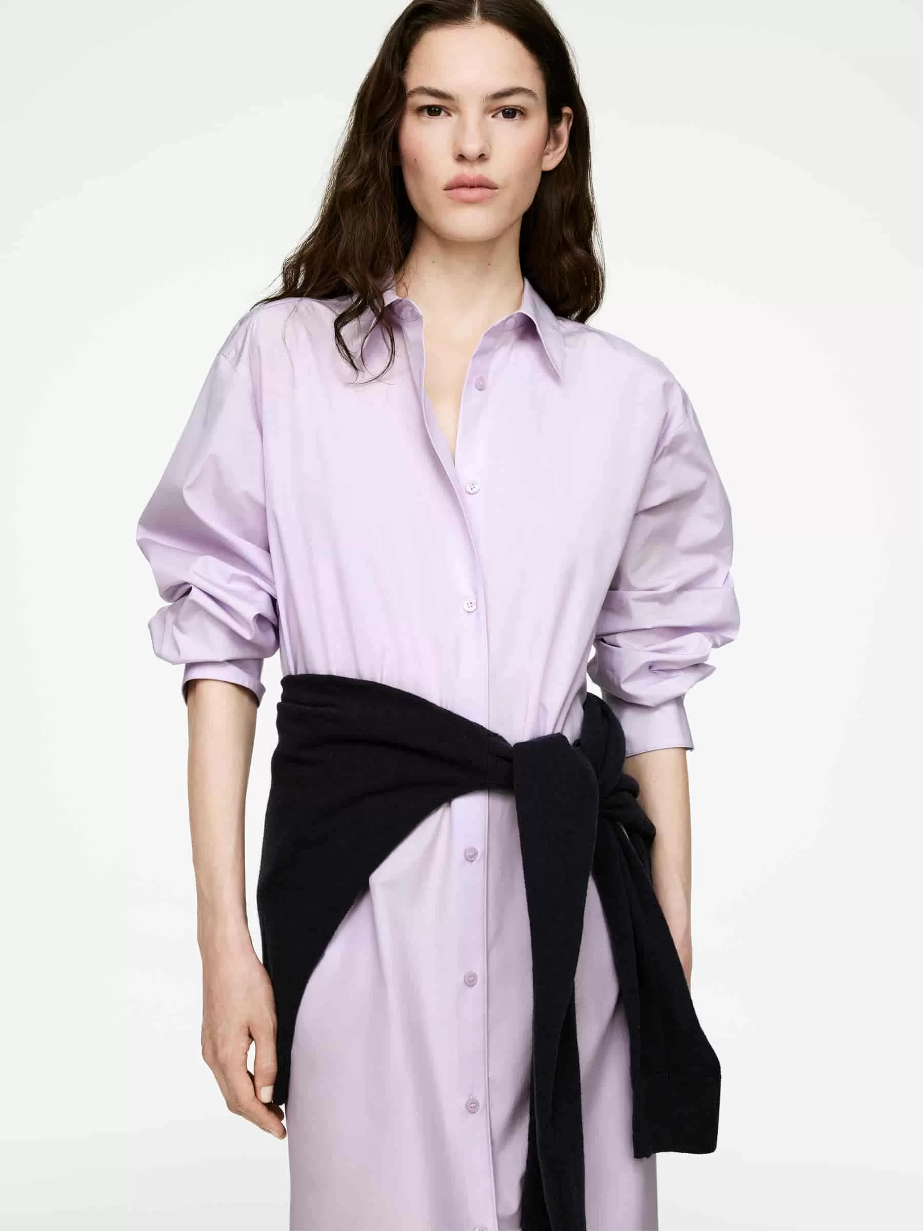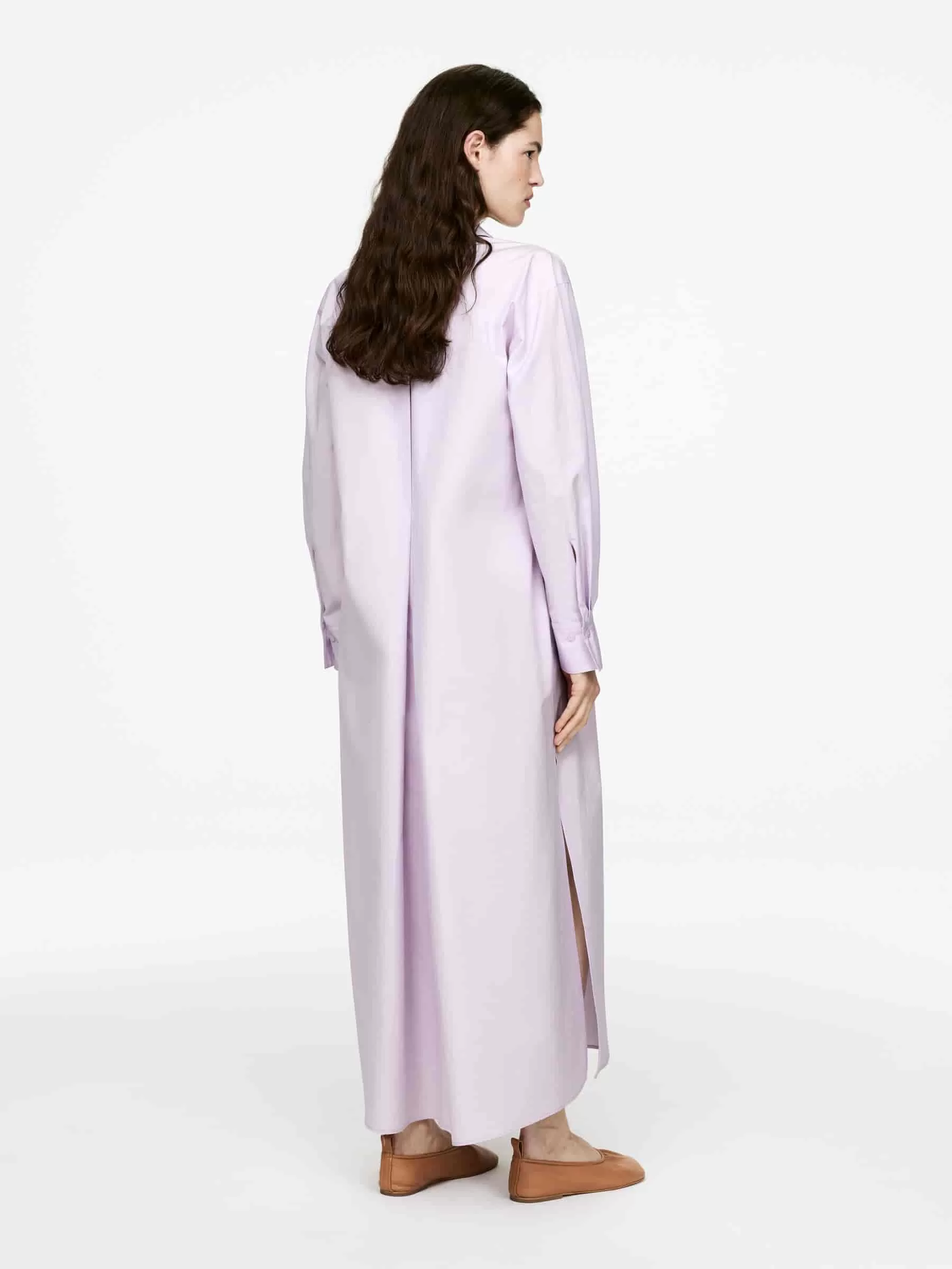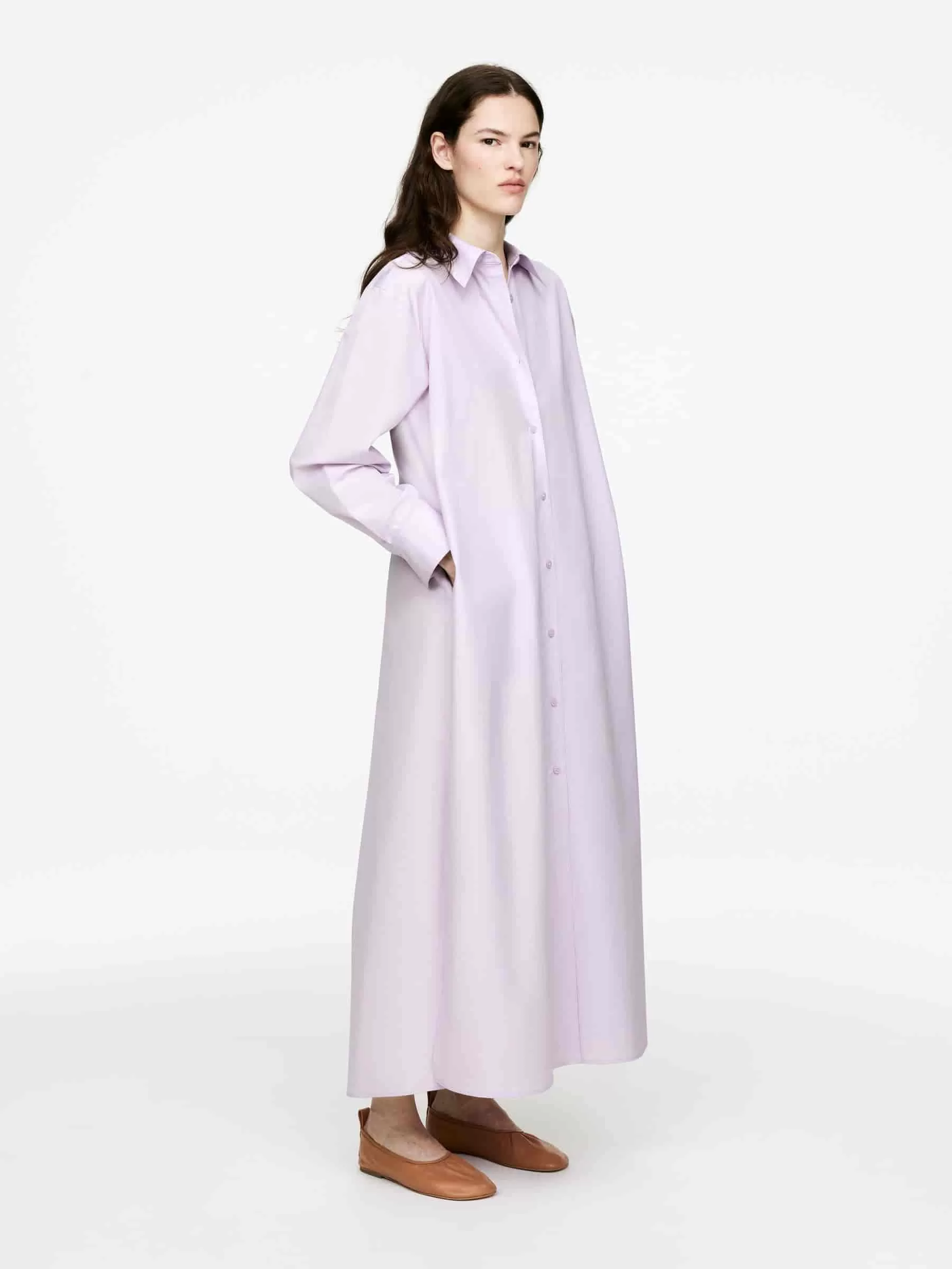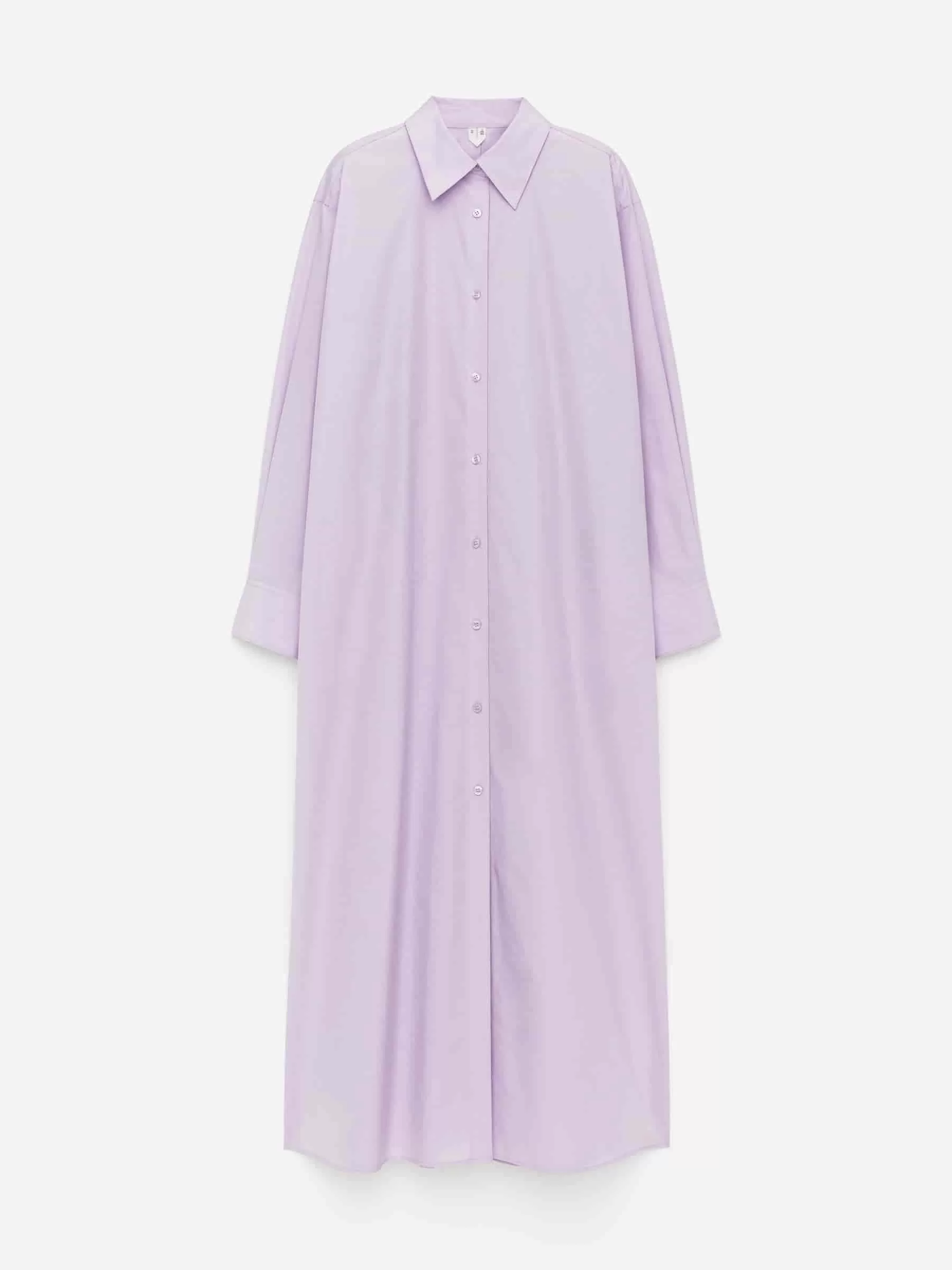 Vestido camisero largo y de corte oversize. Se trata de un modelo abotonado con cuello camisero, bolsillos laterales y aberturas a los lados. Pliegue en forma de caja en el centro de la espalda. Mangas con costura de hombros caídos y puños abotonados.