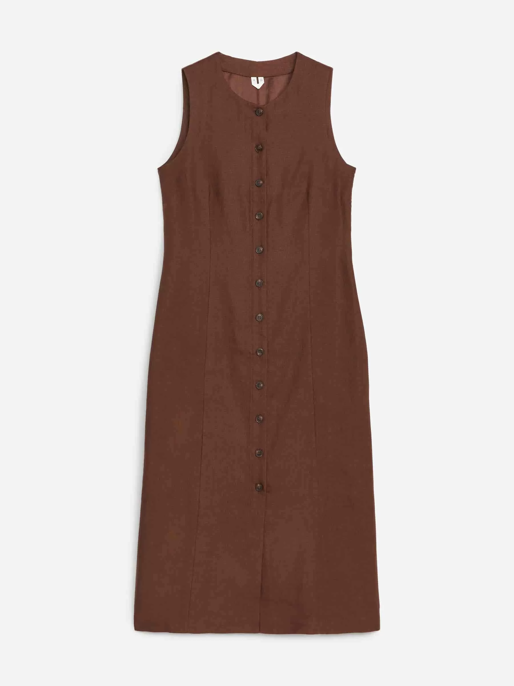 Vestido sin mangas confeccionado en lino. Un estilo abotonado con un corte entallado.