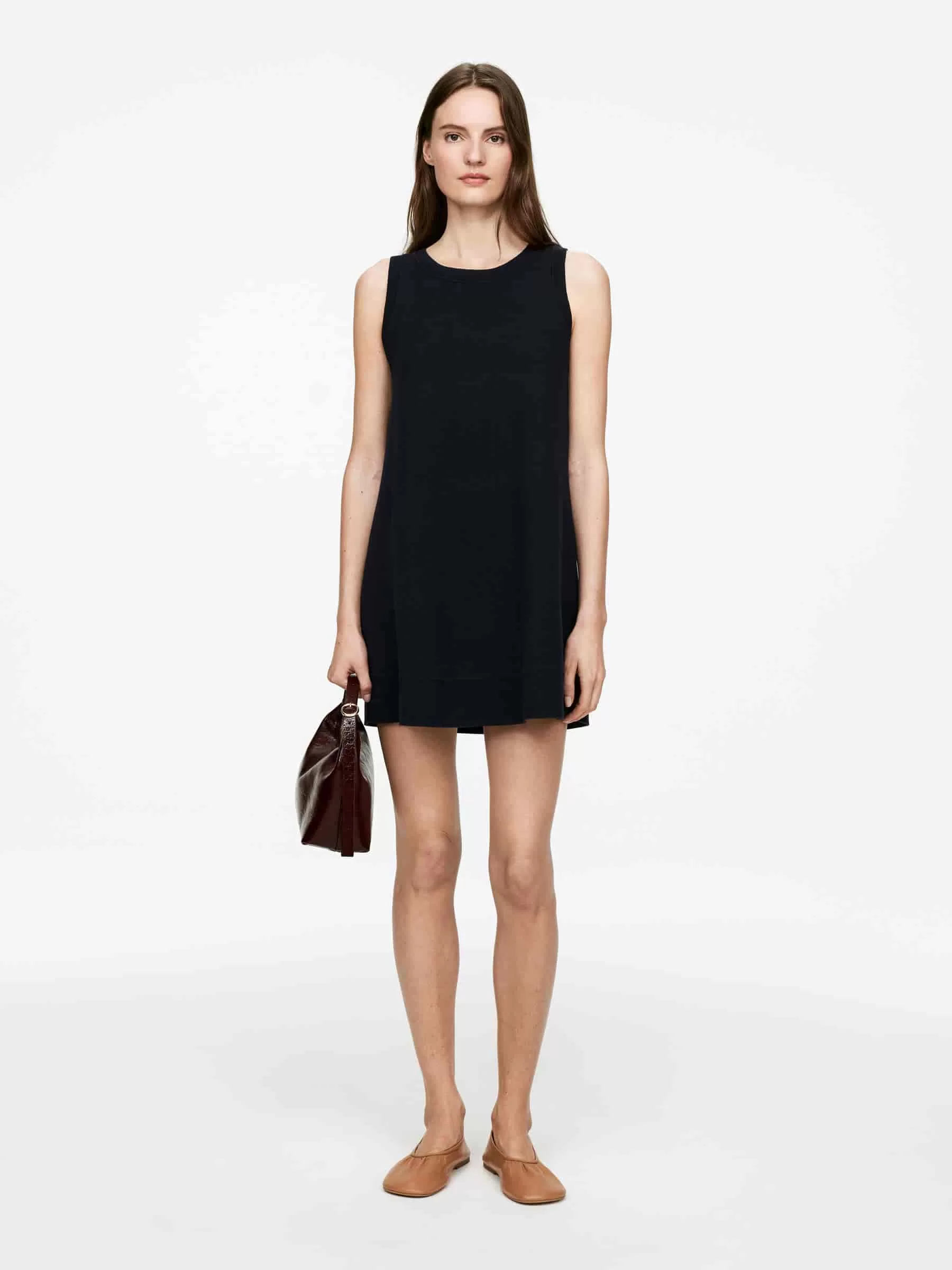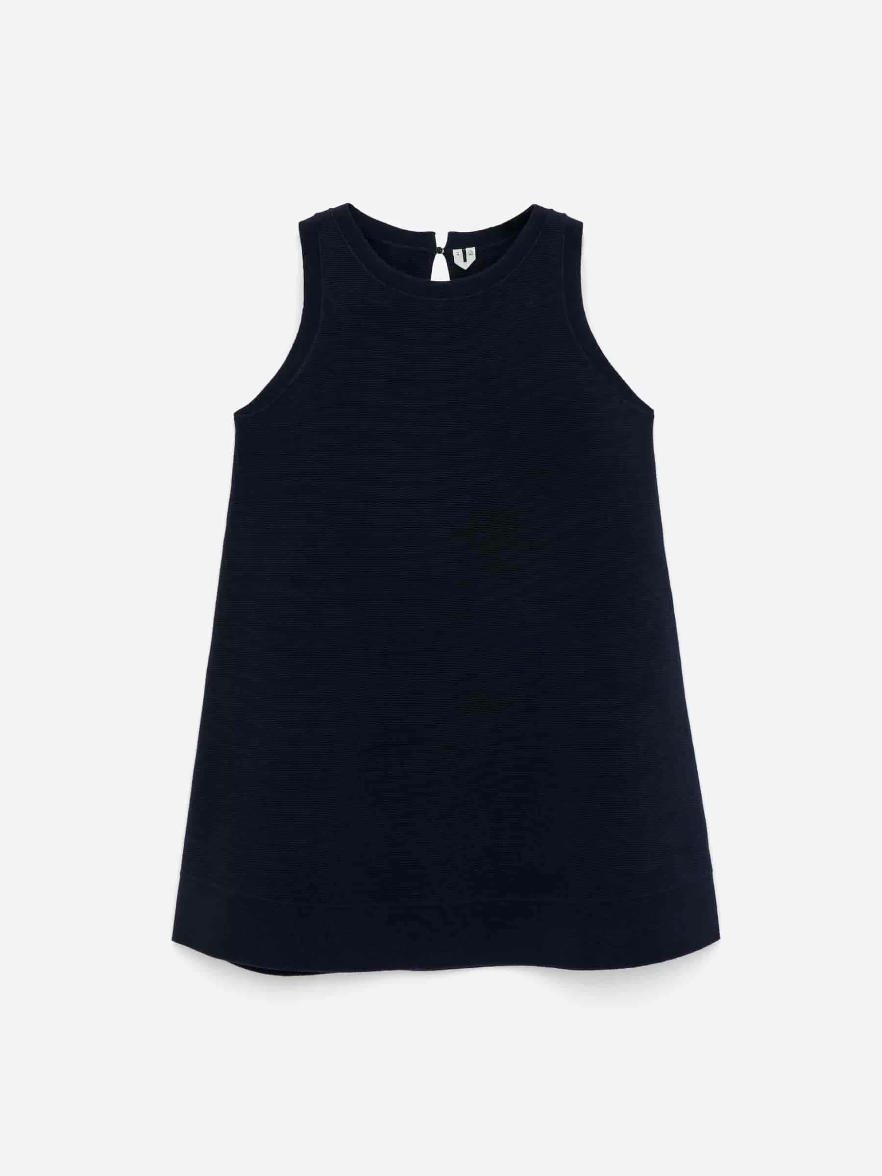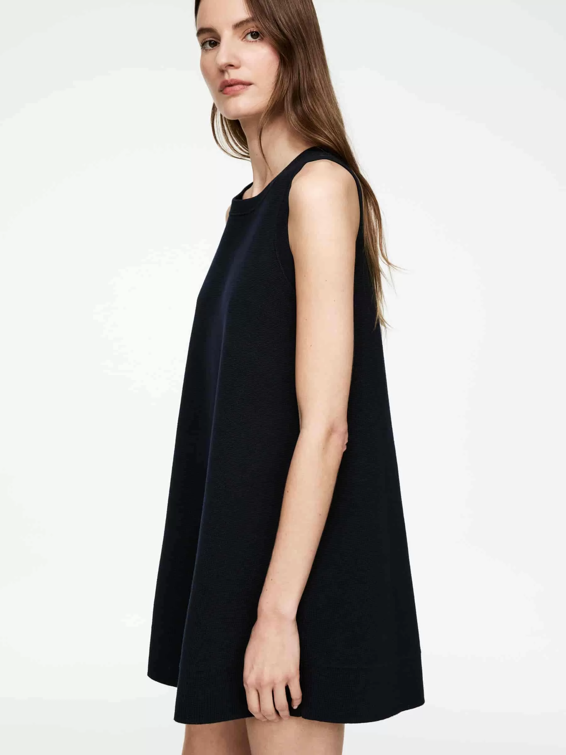 Minivestido evasé tejido de algodón. Un estilo sin mangas con corte holgado y abertura con forma de cerradura con botón en el centro de la espalda.