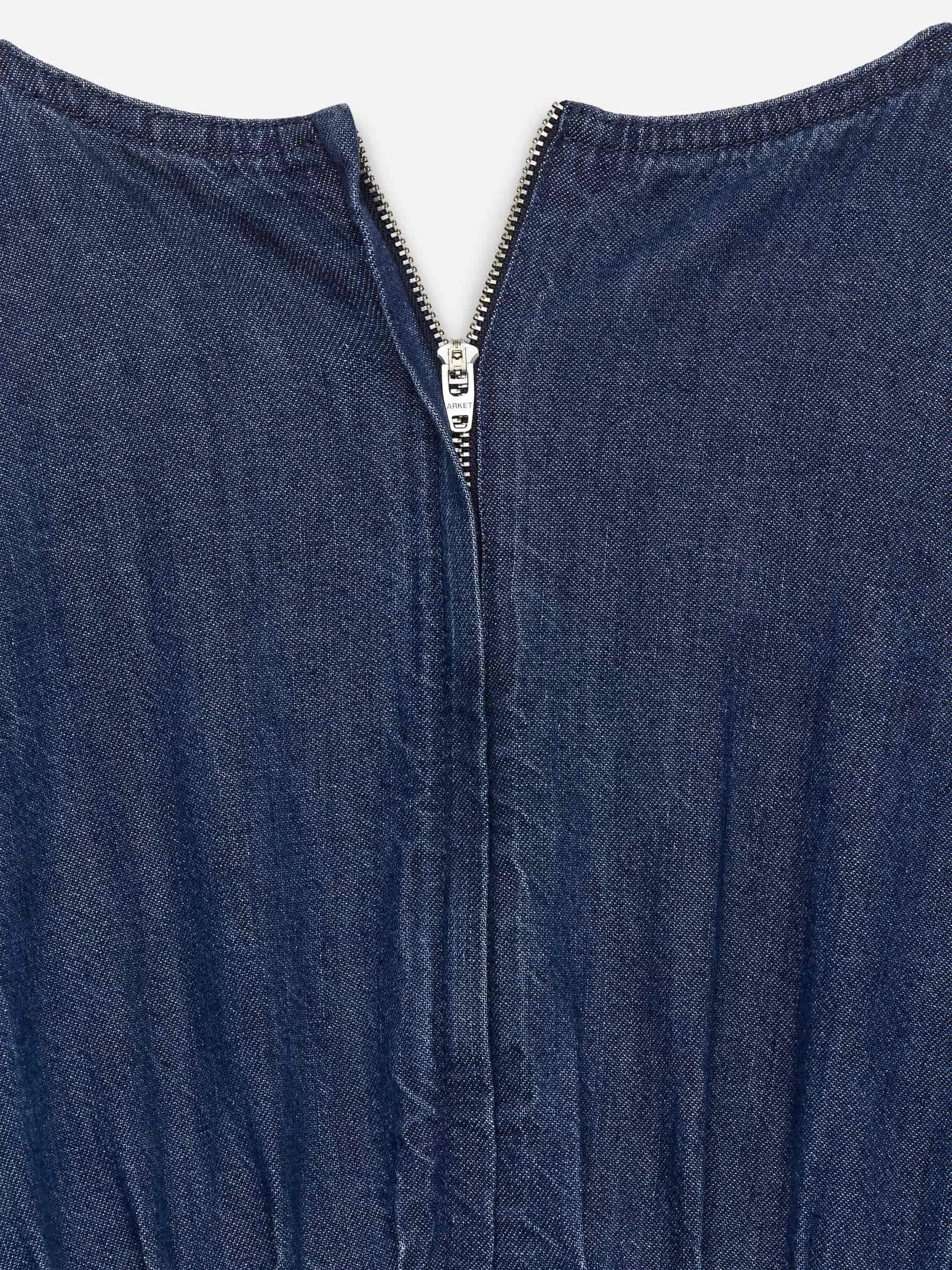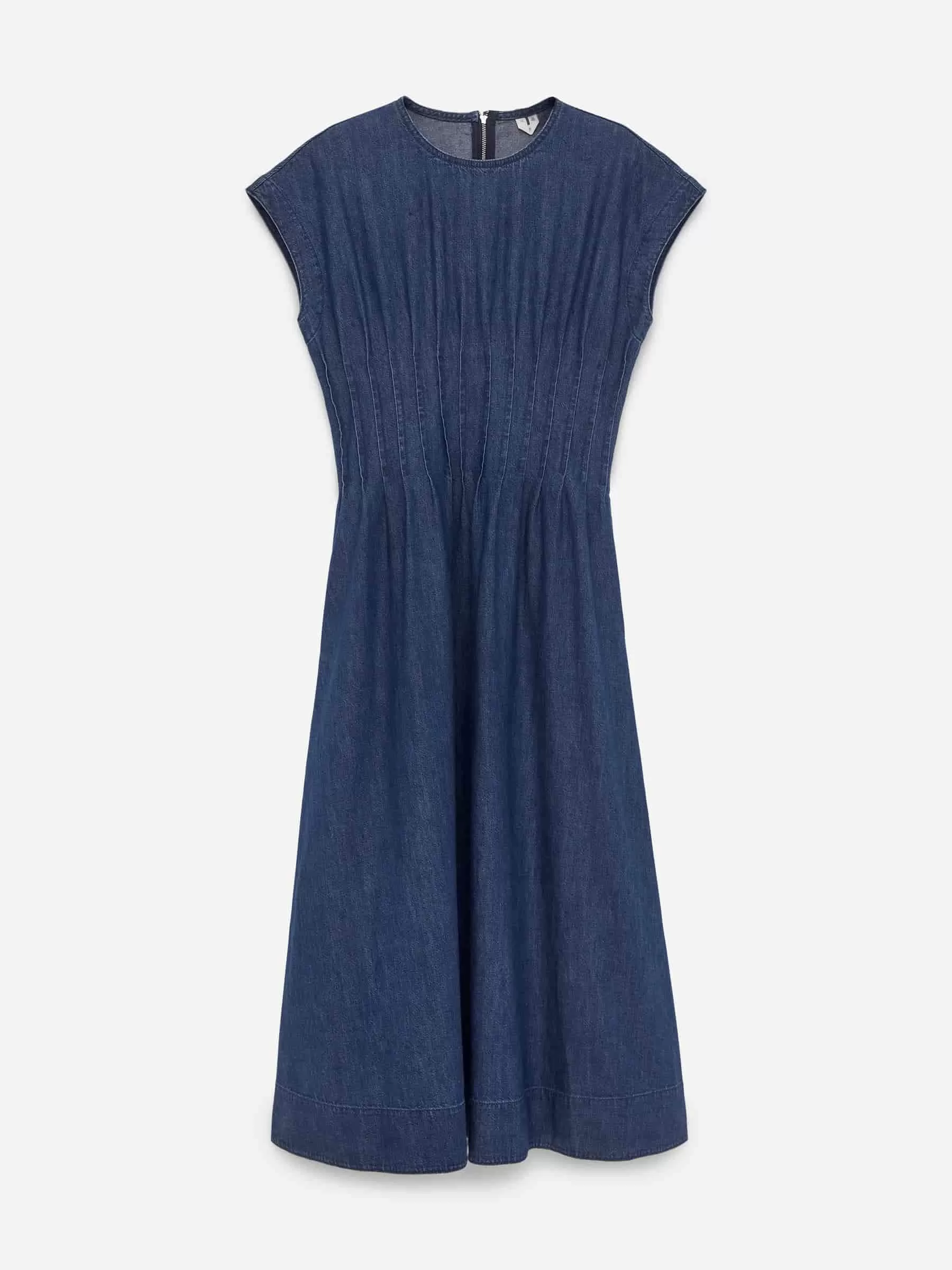 Vestido midi vaquero confeccionado en algodón. Un modelo sin mangas con pliegues en la cintura, cremallera en el centro de la espalda y bolsillos laterales. Ajuste regular.