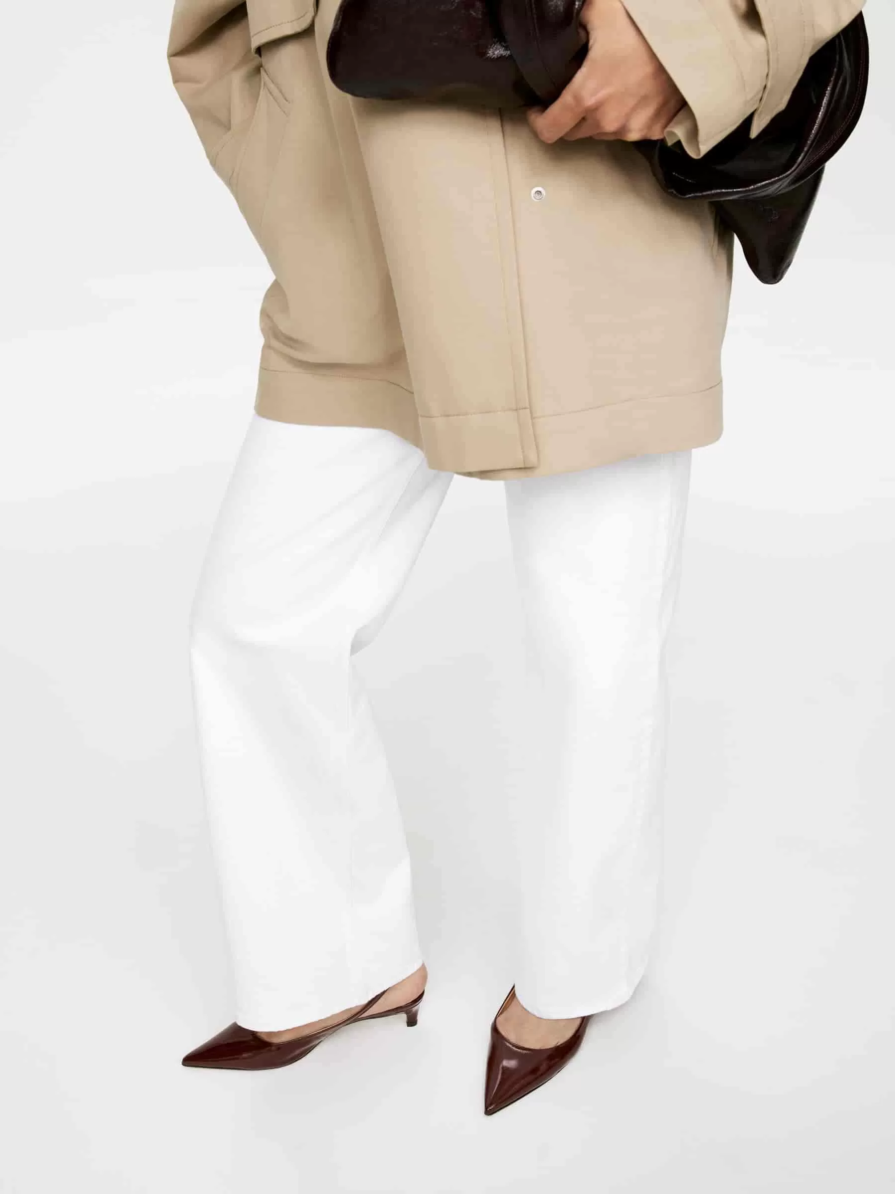 Zapatos de salón destalonado en piel brillante con puntera en punta. Cierre de hebilla en tono dorado en el lateral. Altura tacón 4 cm.