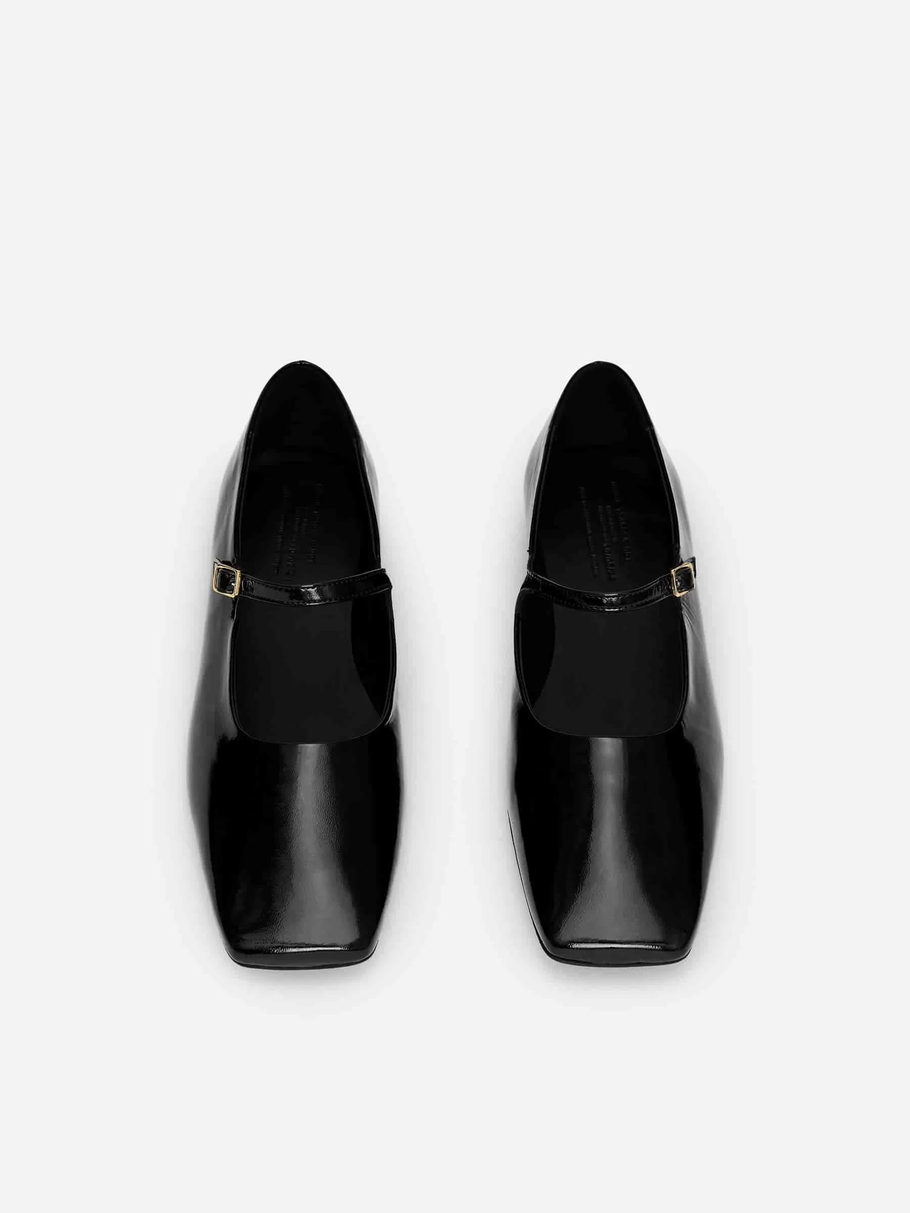 Bailarinas de cuero con punta cuadrada y suela plana. Correa delgada con delicado cierre de hebilla bañada en oro. Suela de goma fina.