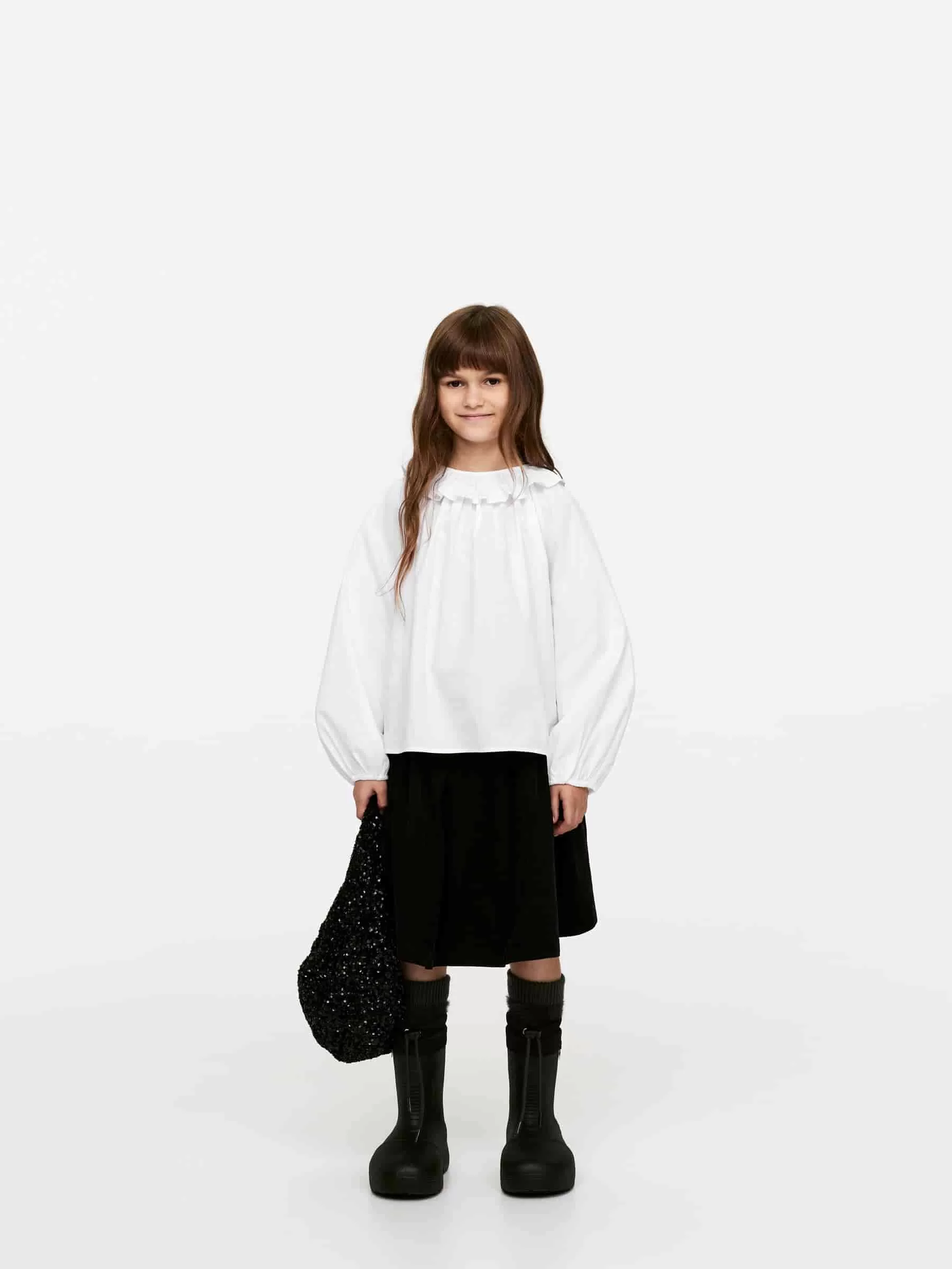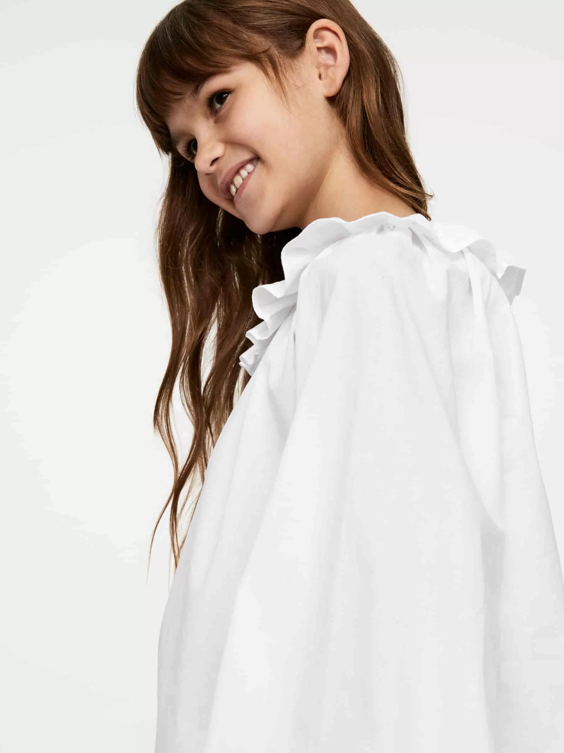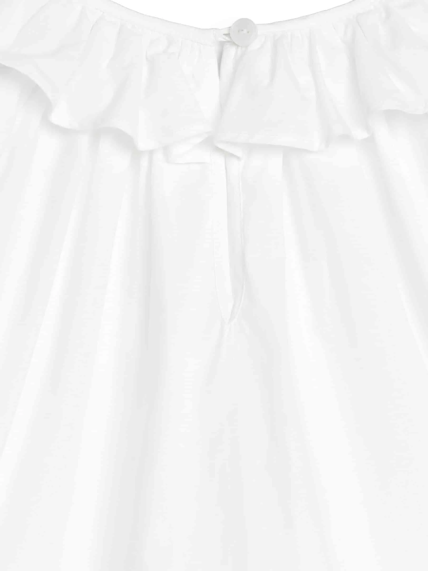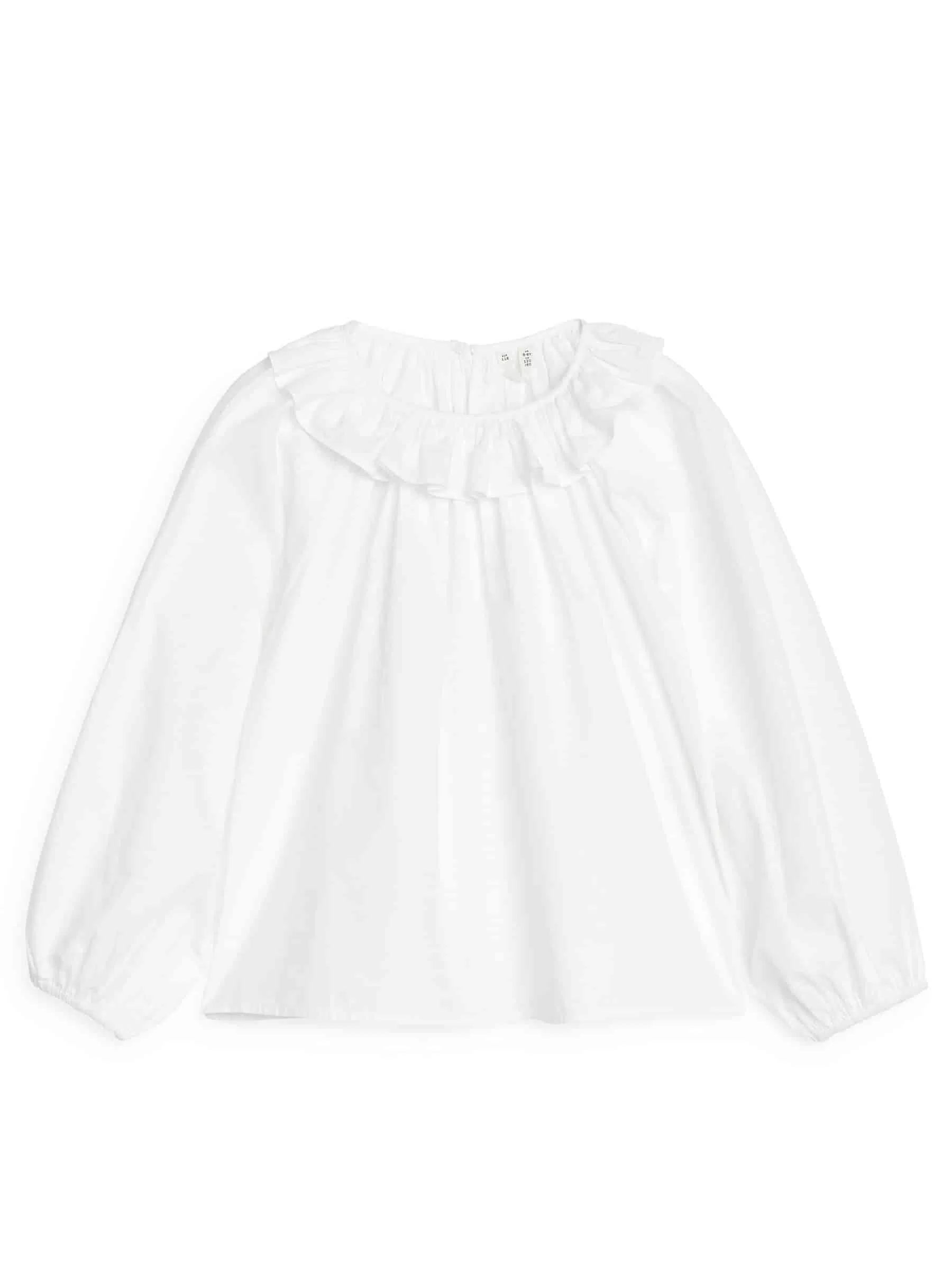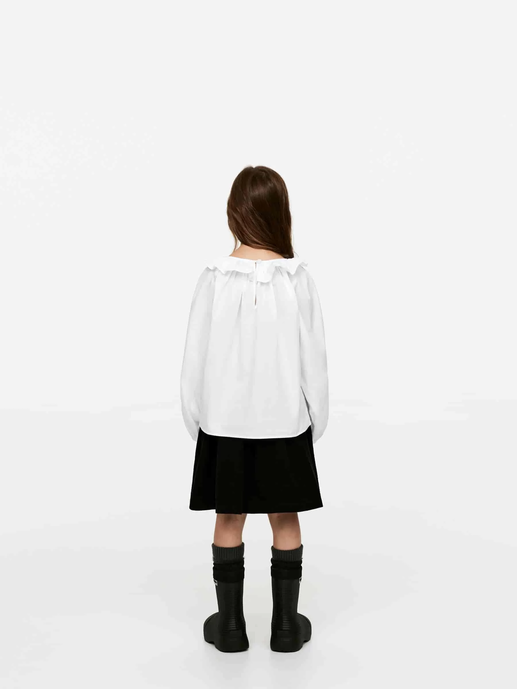 Blusa de algodón con cuello de volante y manga raglán. Cierre de trabilla y botón en el centro de la espalda.
