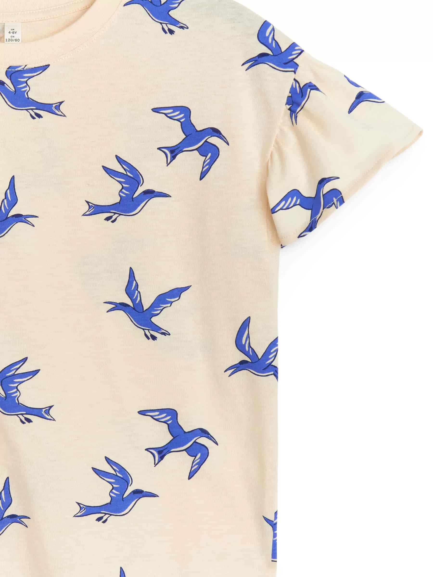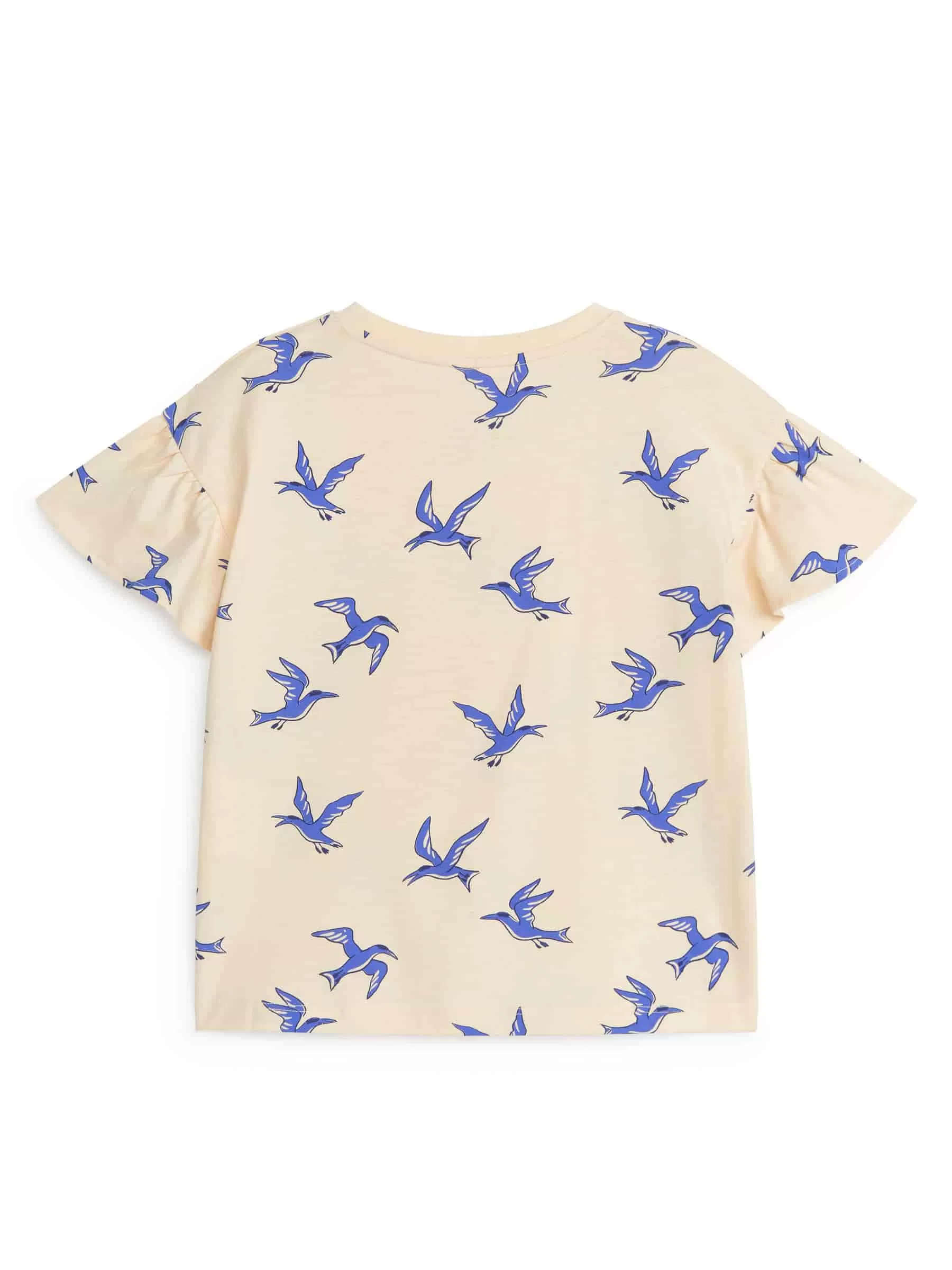 Camiseta de manga corta confeccionada en un tejido single jersey de algodón. Cuello de canalé y volantes en los bordes de las mangas.