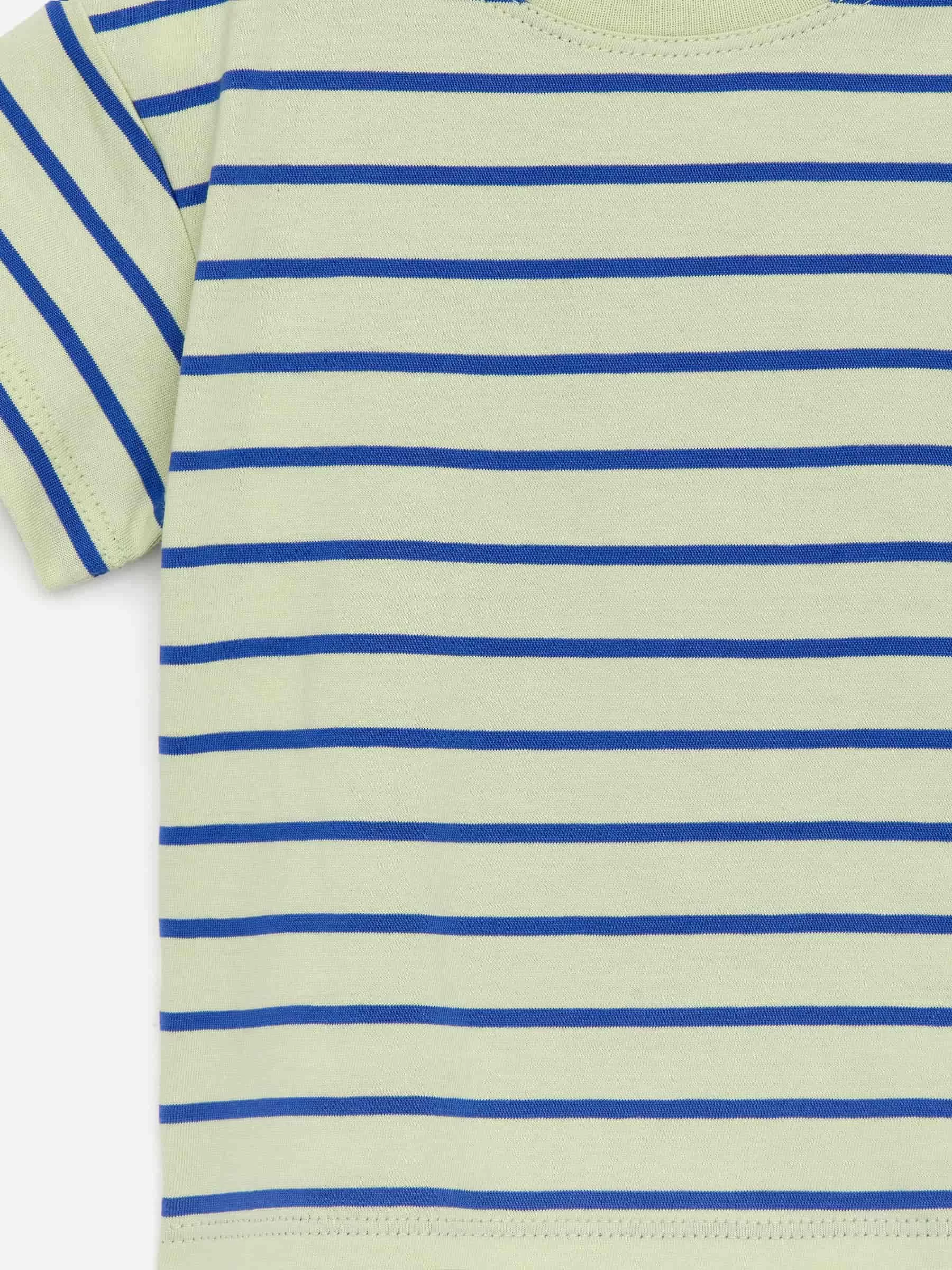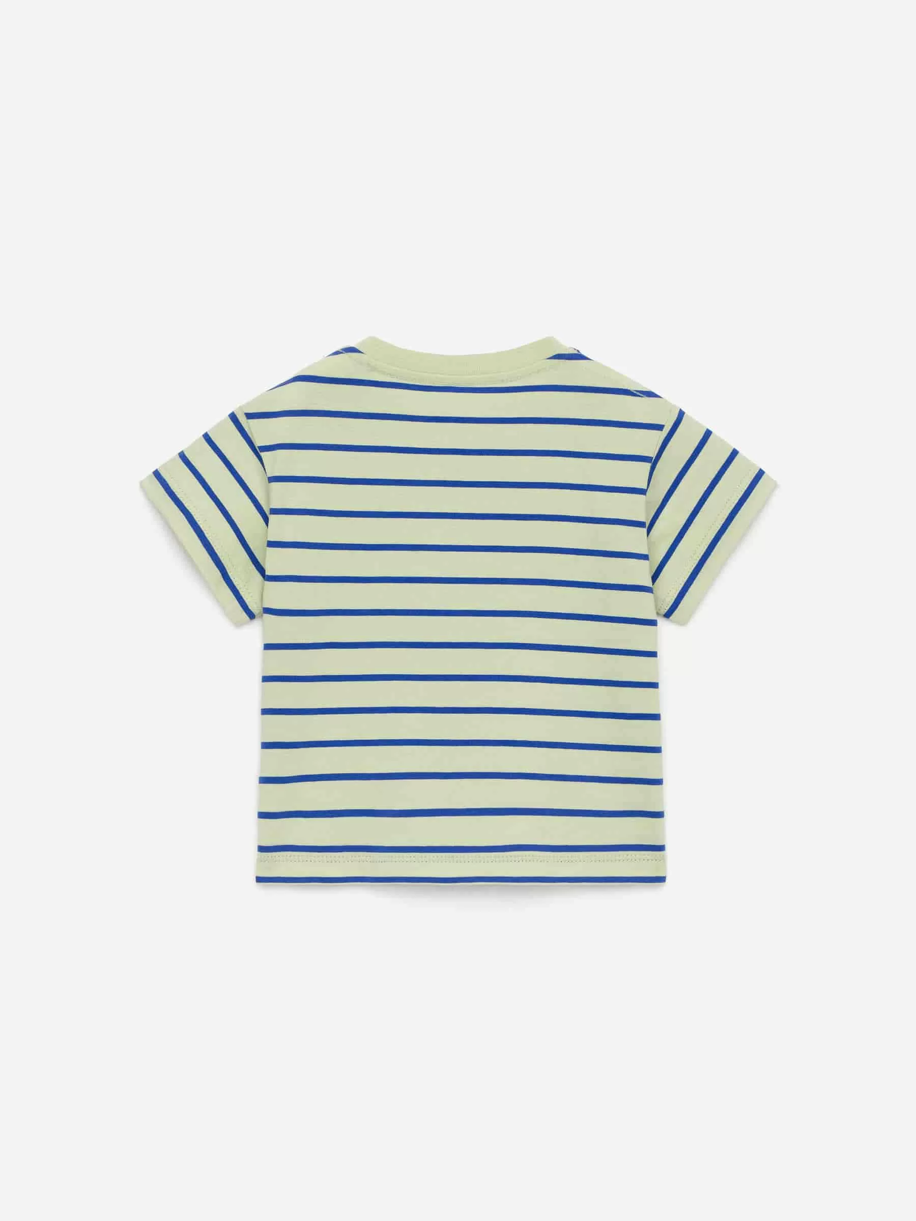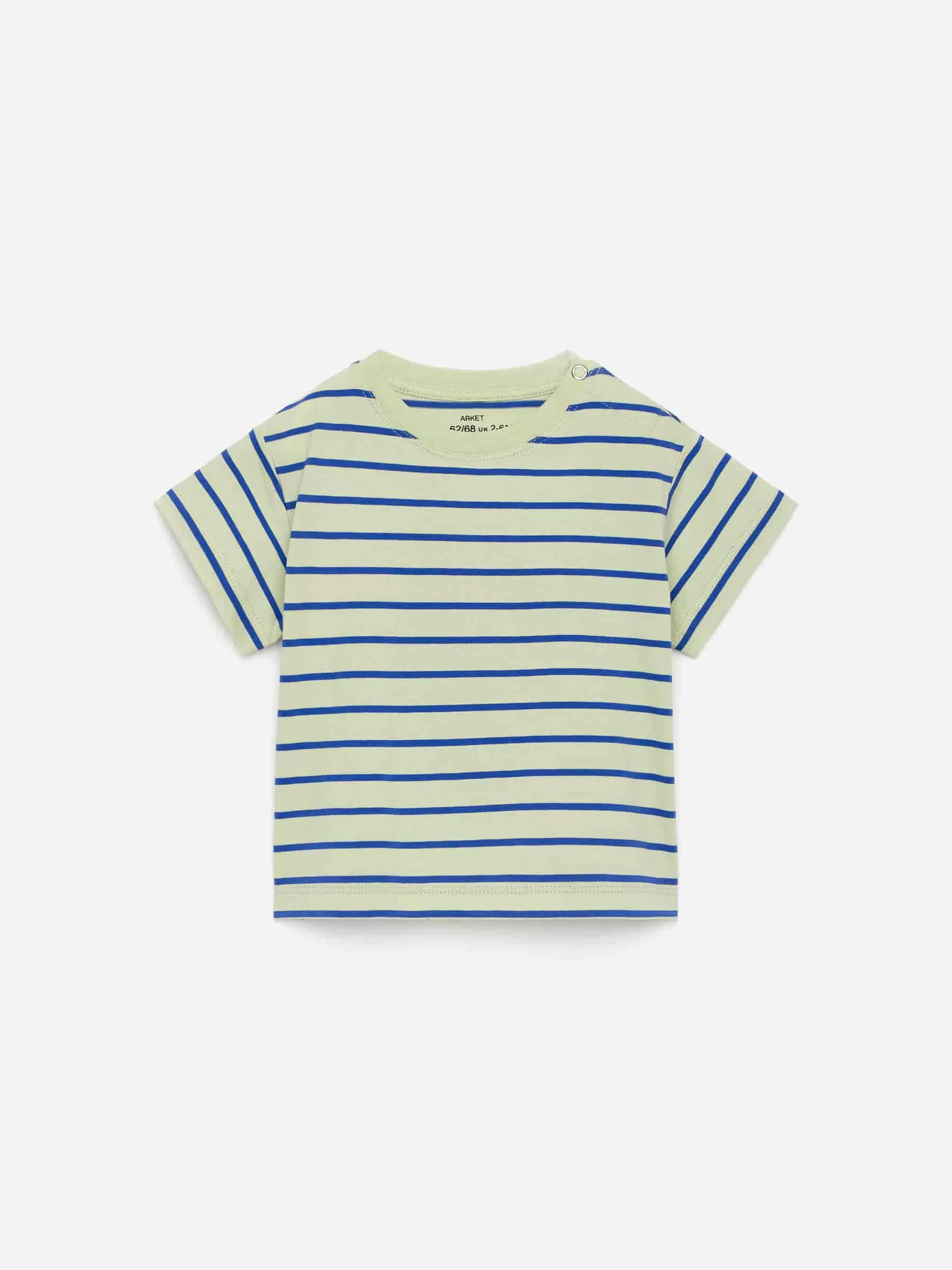 Camiseta de manga corta confeccionada en un suave punto sencillo confeccionado en algodón. Corte holgado con hombros ligeramente caídos. Botonadura a presión en el hombro izquierdo para vestirlo fácilmente. Aberturas en costuras laterales.
