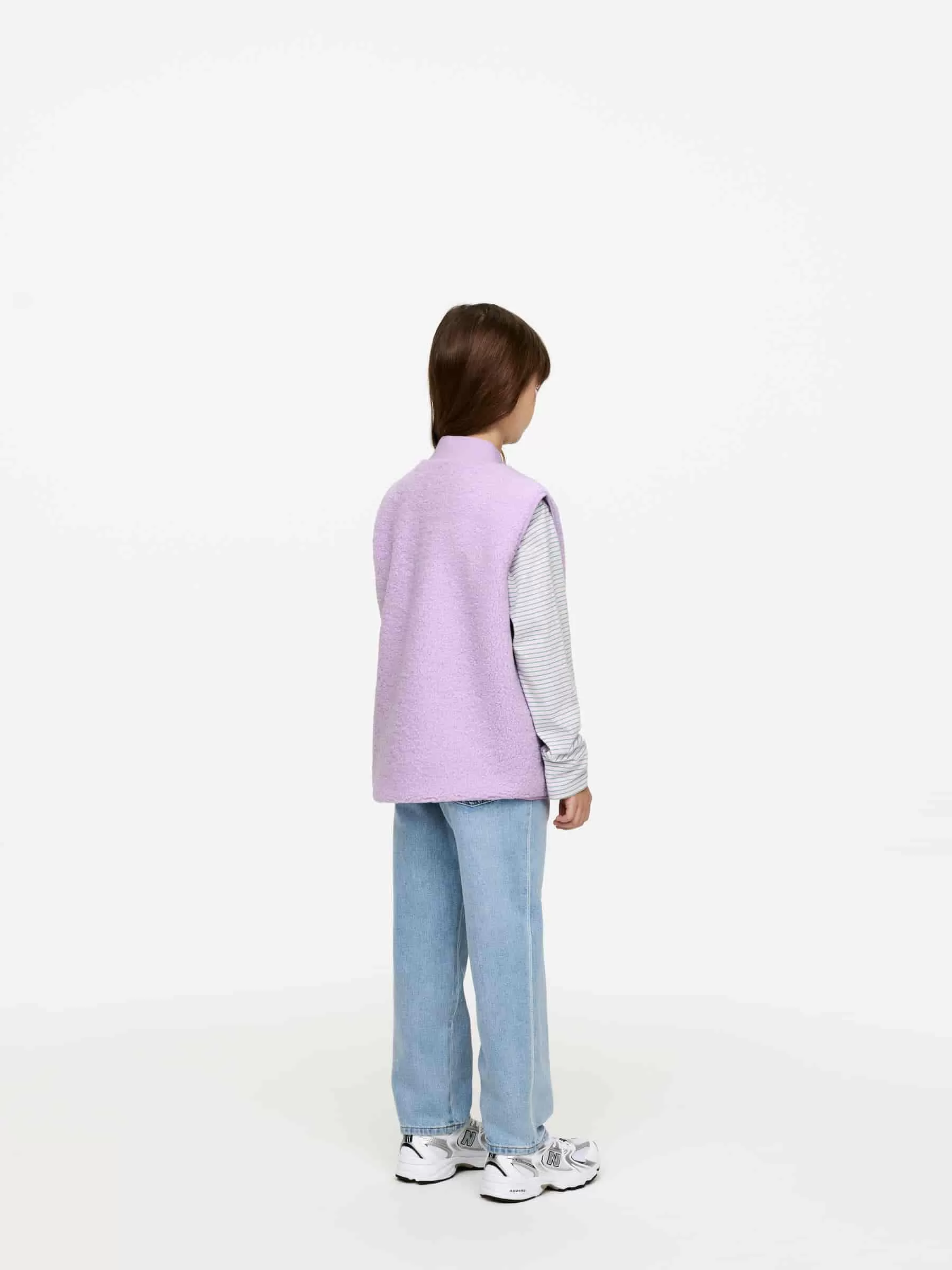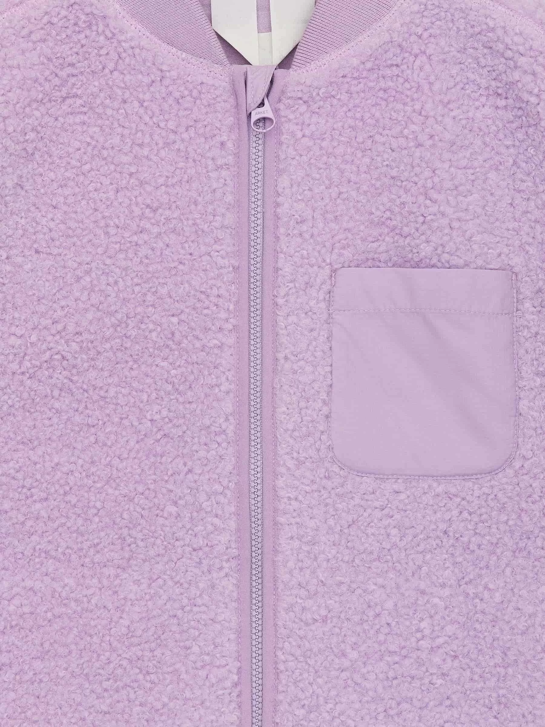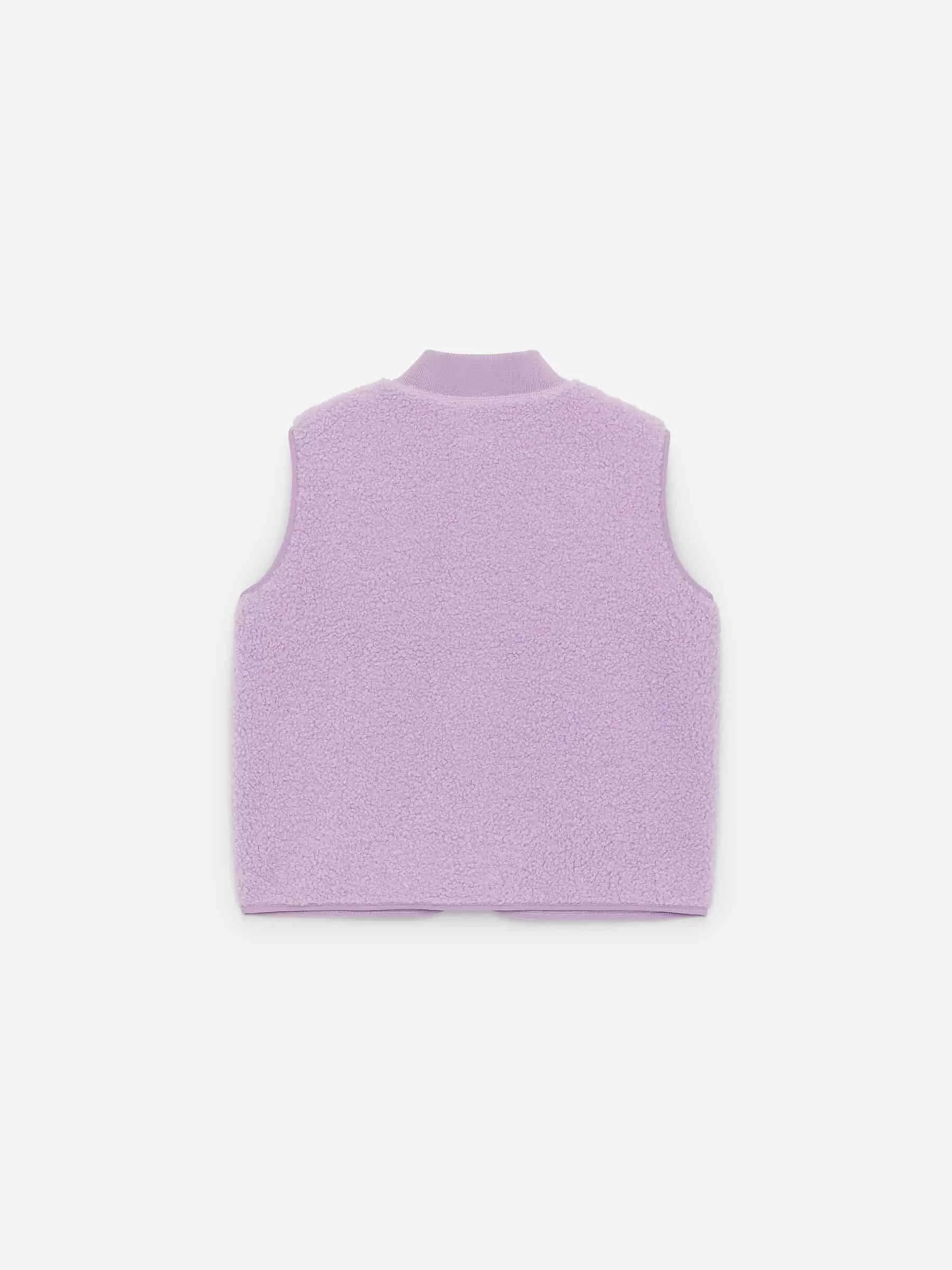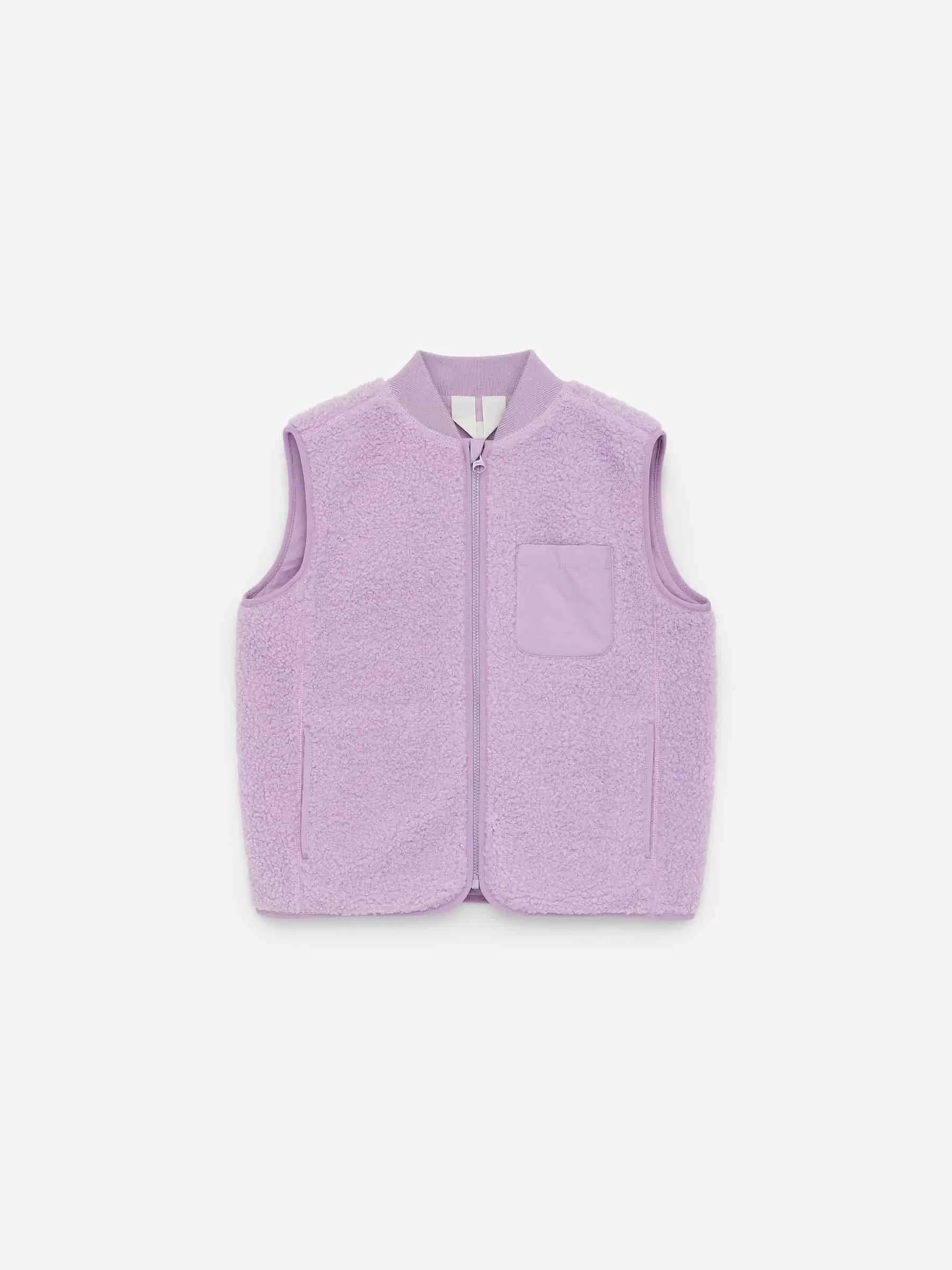 Chaleco confeccionado en un tejido de pelo suave. Bolsillo tipo parche en el pecho y bolsillos ribeteados a los lados. Cierre con cremallera y canalé en el cuello.