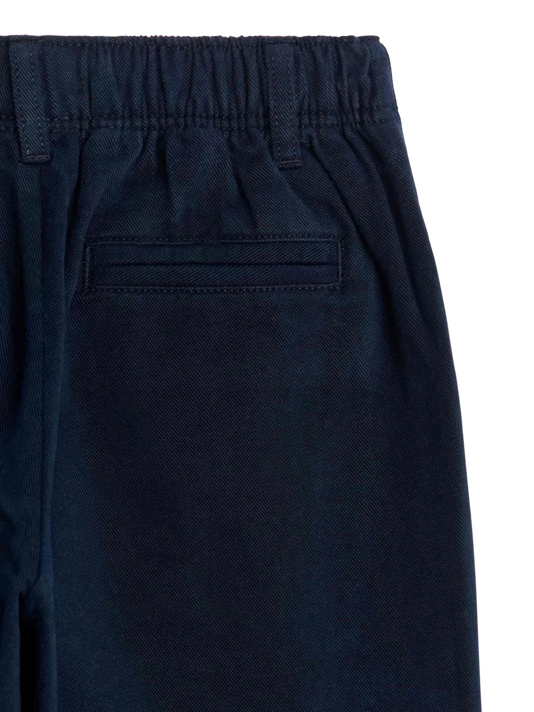 Chinos confeccionados en sarga de algodón. Con un corte entallado y detalles con cinturilla elástica ajustable, trabillas para cinturón y bragueta falsa. Bolsillos delanteros y un único bolsillo de vivo en la parte trasera.