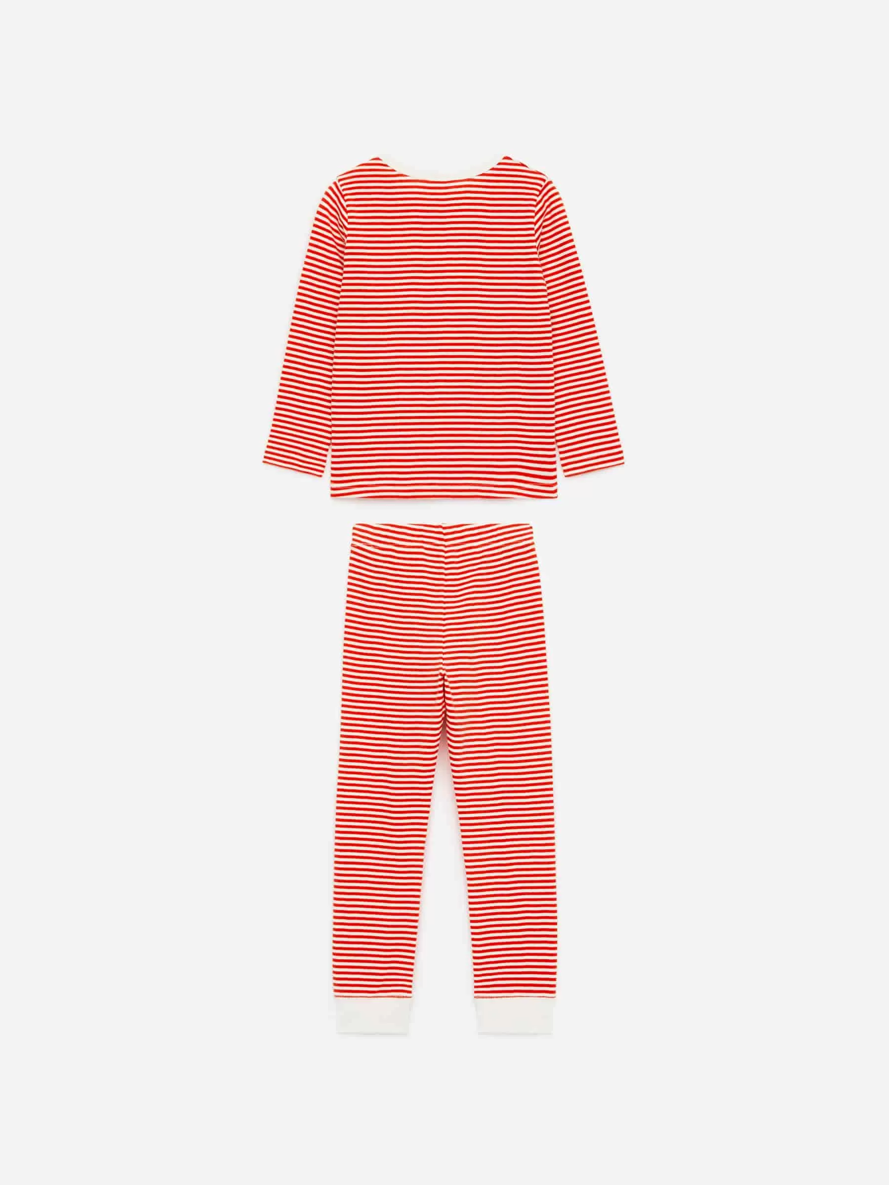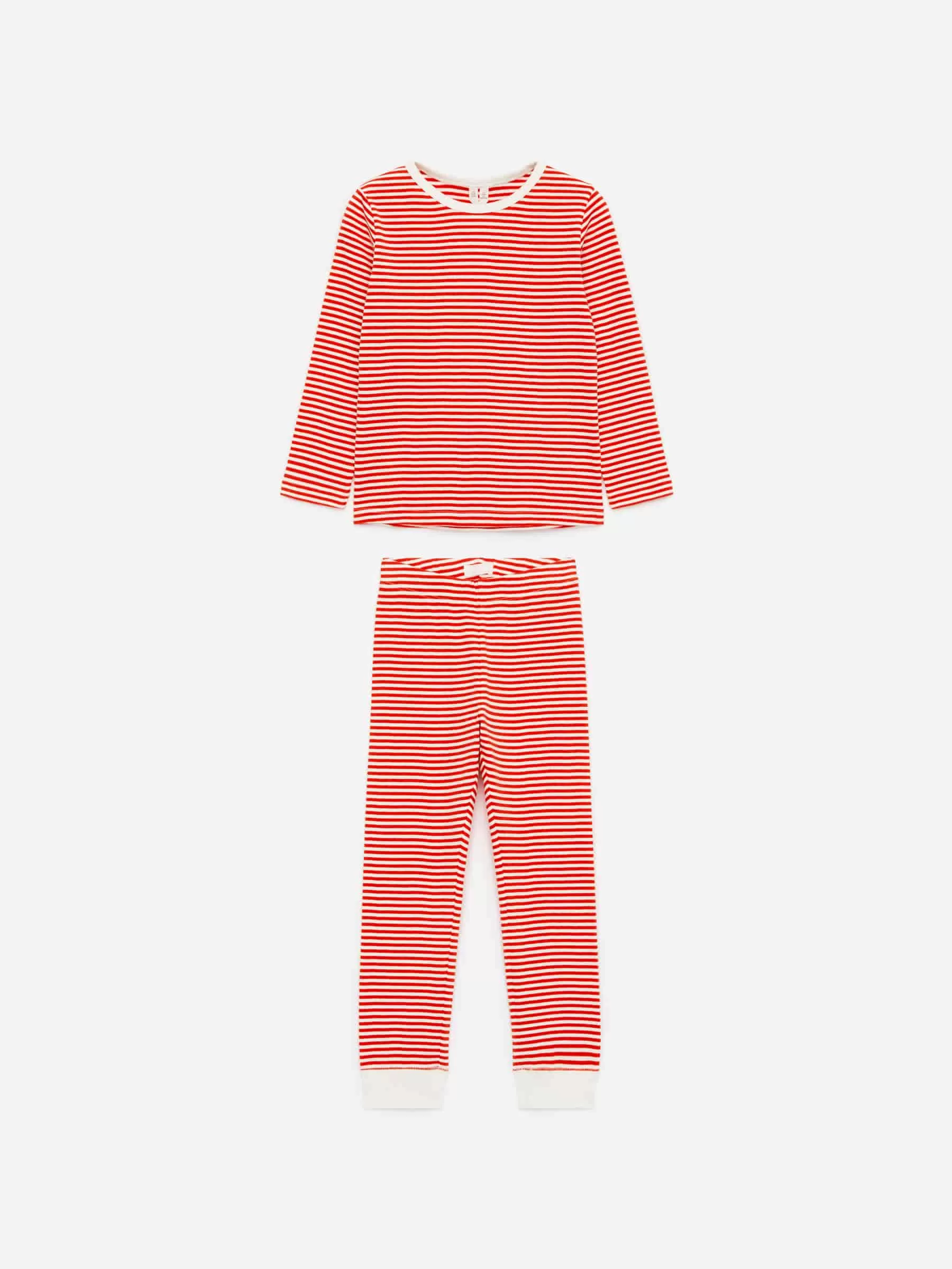 Cosido con un suave tejido de punto sencillo, este pijama de dos piezas está hecho de algodón. Un top de pijama con cuello redondo y manga larga y pantalón con cintura elástica. Puños de canalé en mangas y piernas.