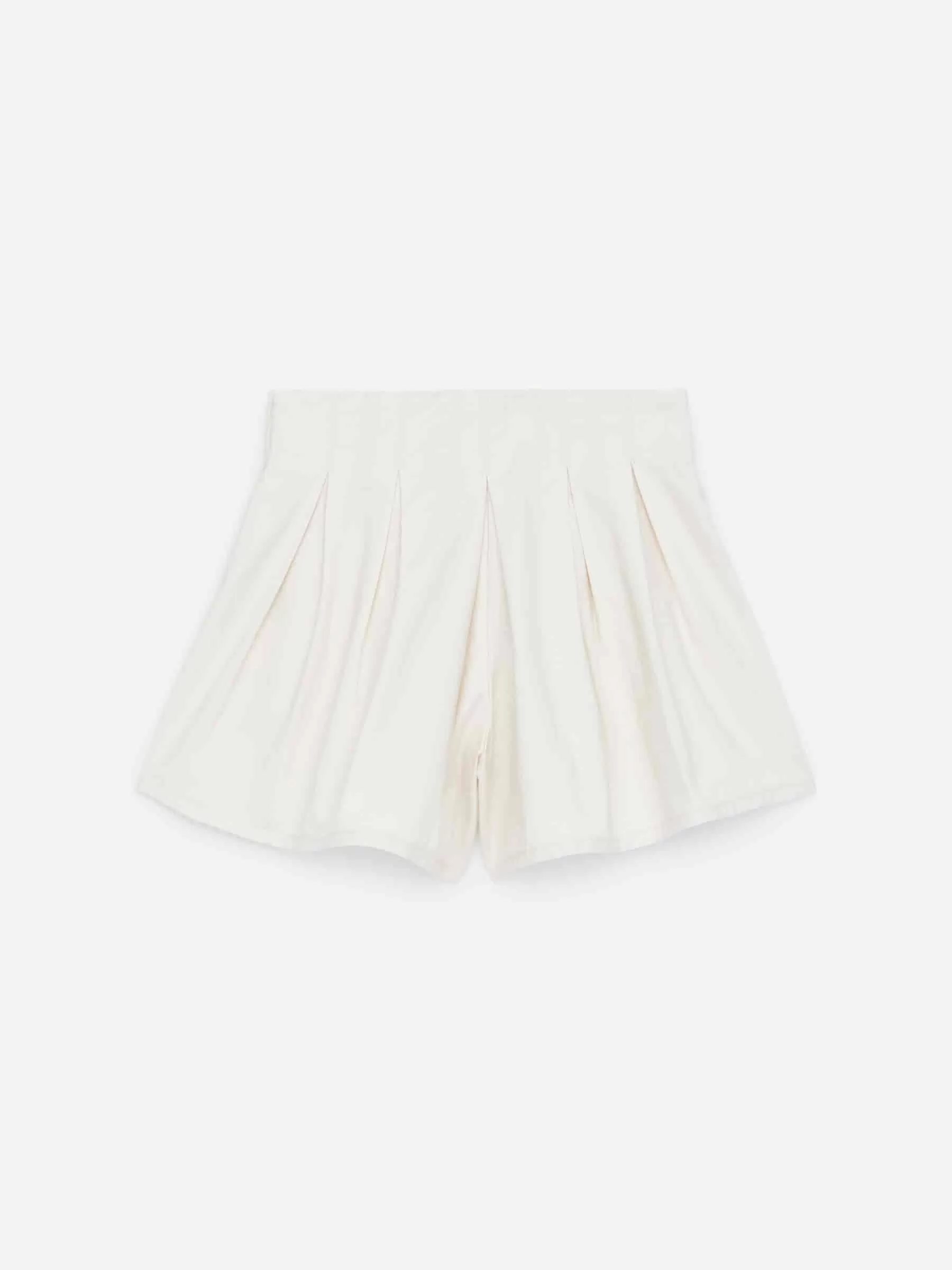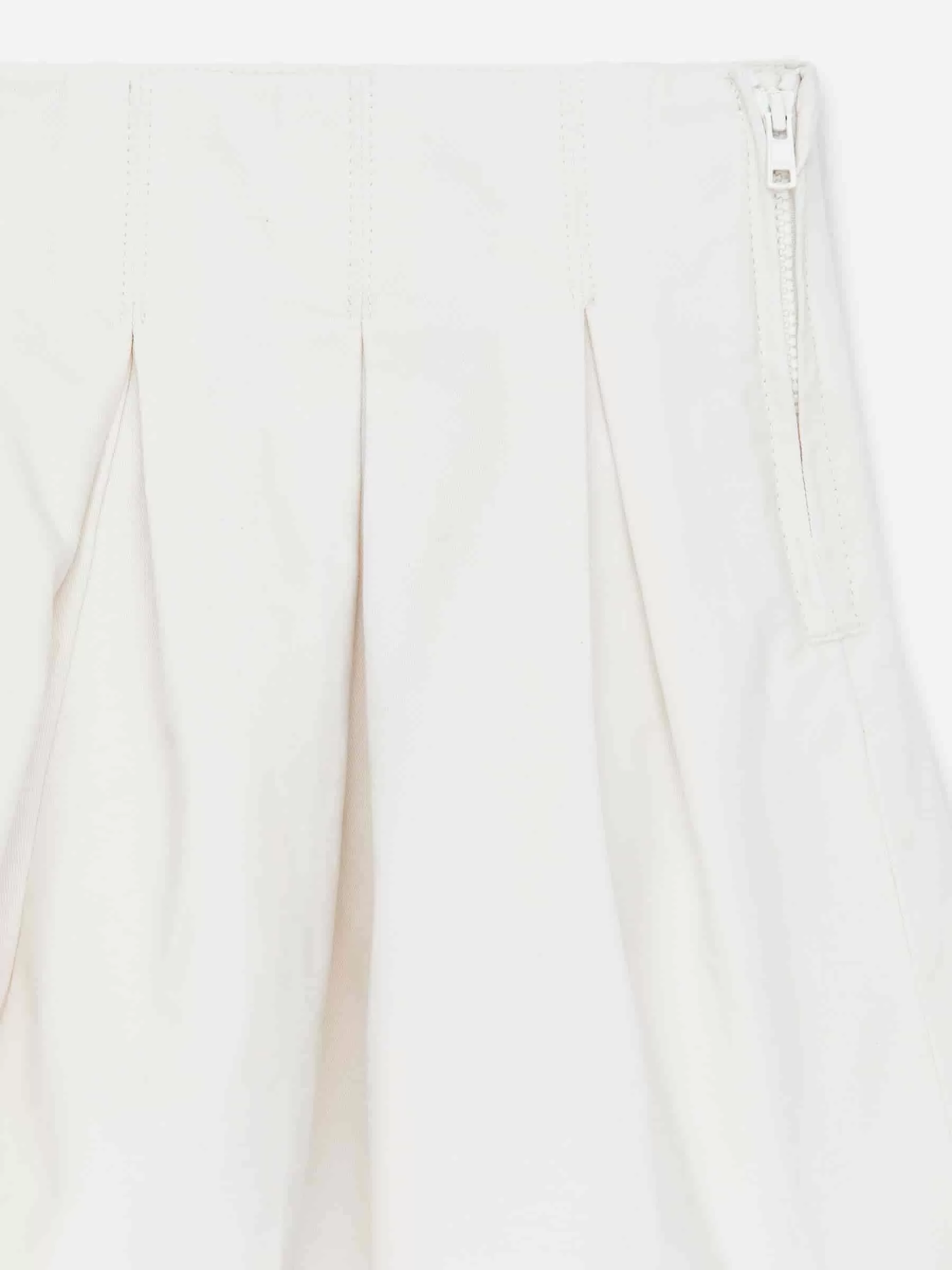 Falda-short de algodón con elásticos ajustables en cintura, cremallera oculta en costura lateral y detalle de pliegues.