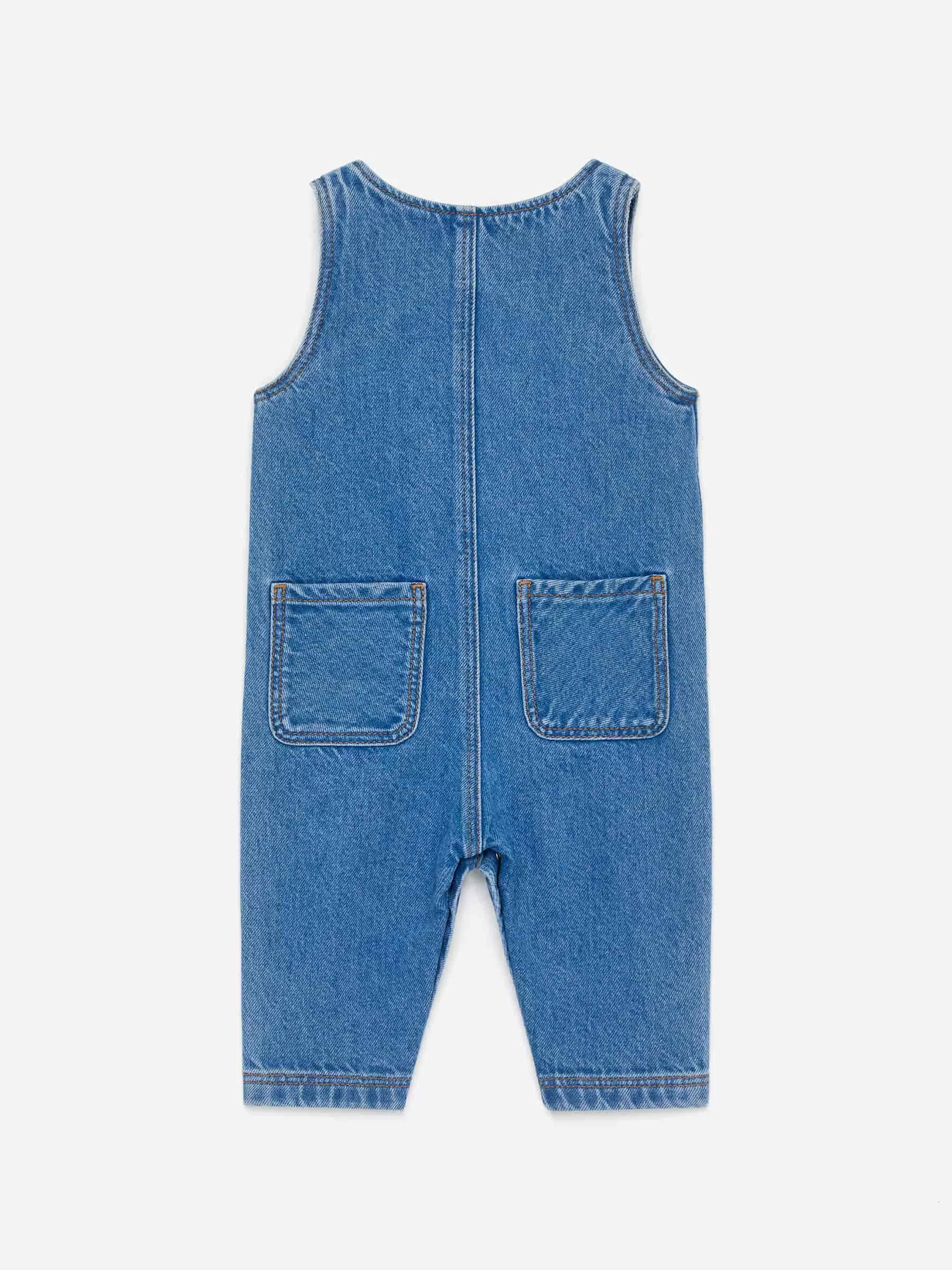Mono sin mangas confeccionado en sarga vaquera confeccionada en algodón. Botones a presión en la parte delantera y en la entrepierna para todas las tallas excepto la 86-92. Bolsillos traseros.
