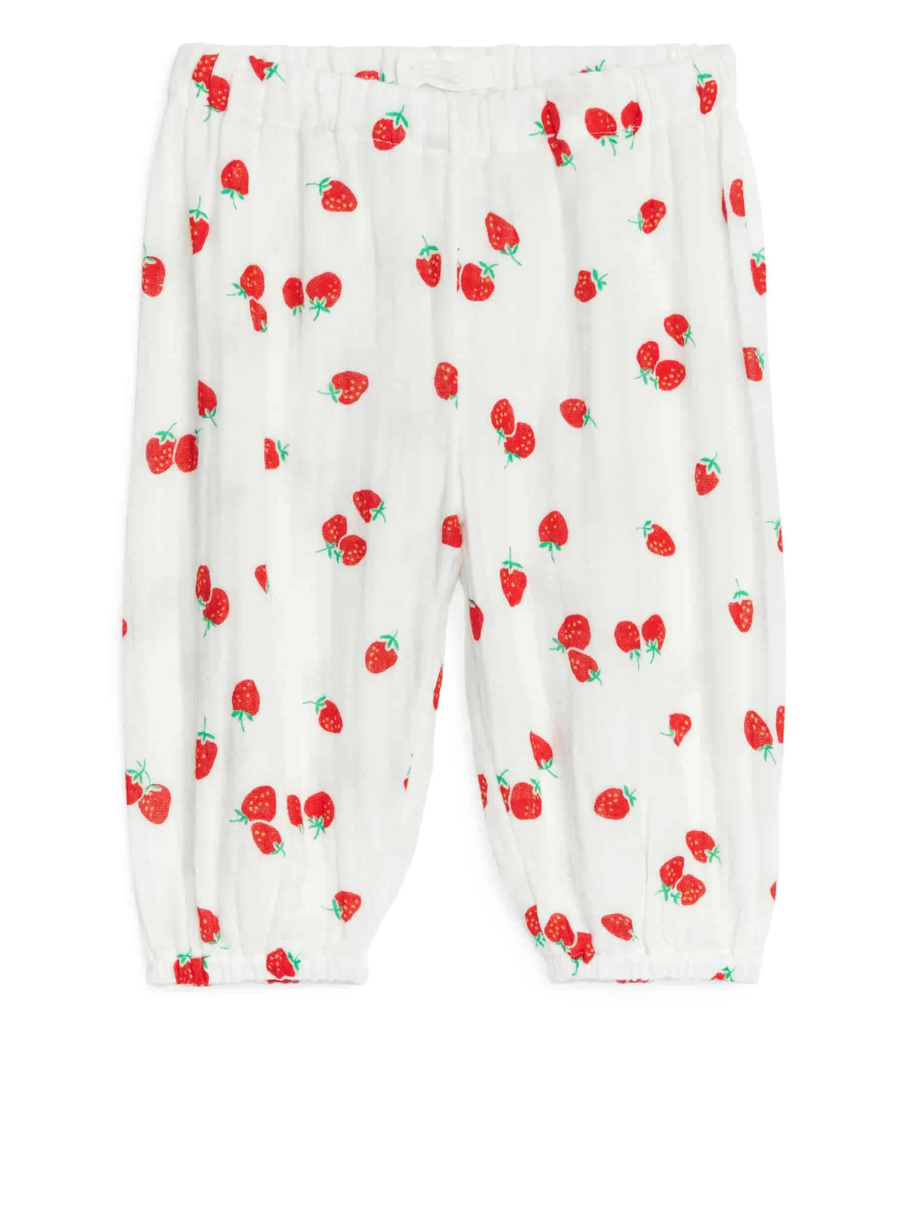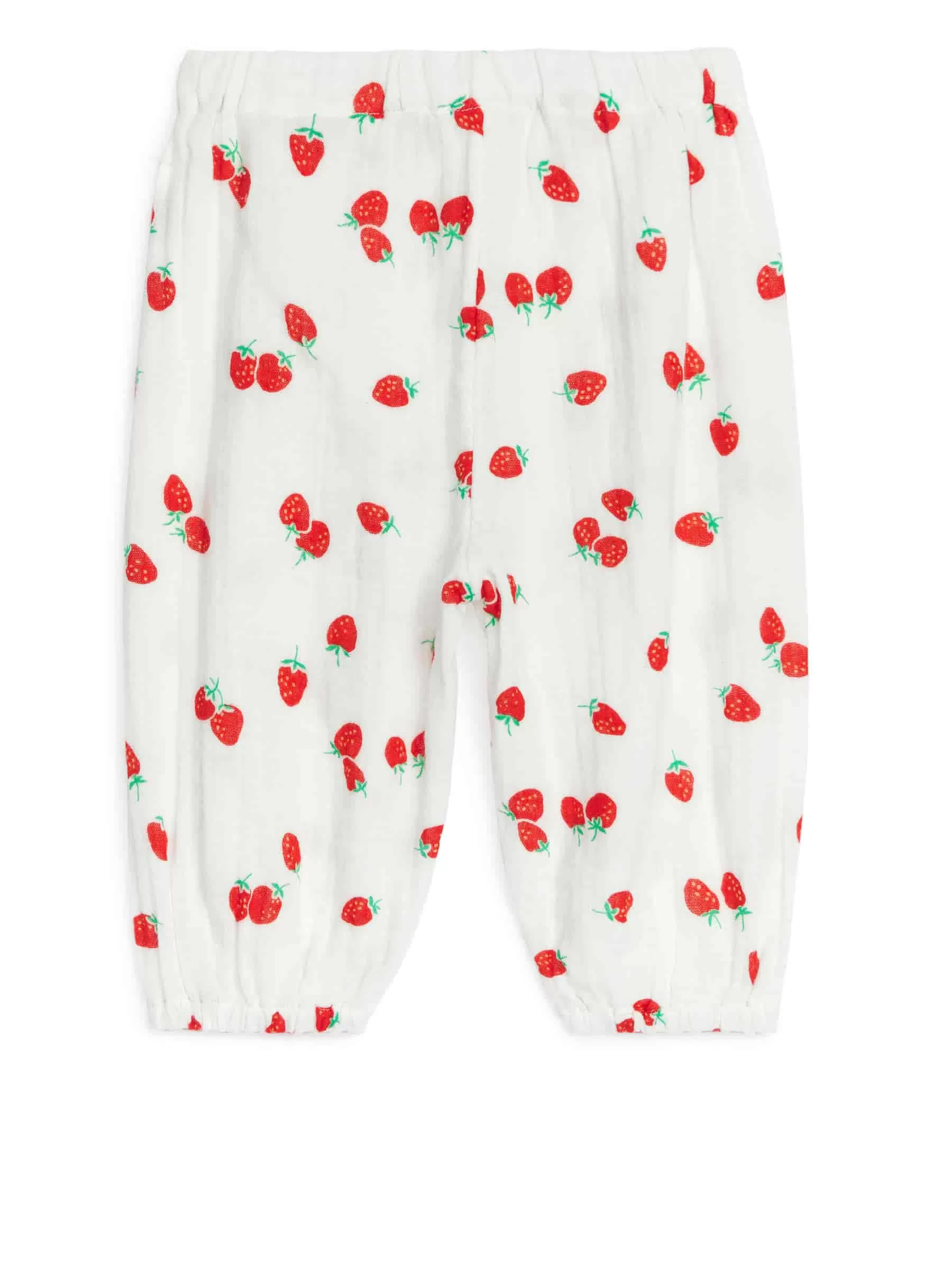 Pantalones confeccionados con un suave material de estopilla tejido de algodón. Un práctico modelo sin cordones con elásticos ajustables en la cintura y en los extremos de las piernas.