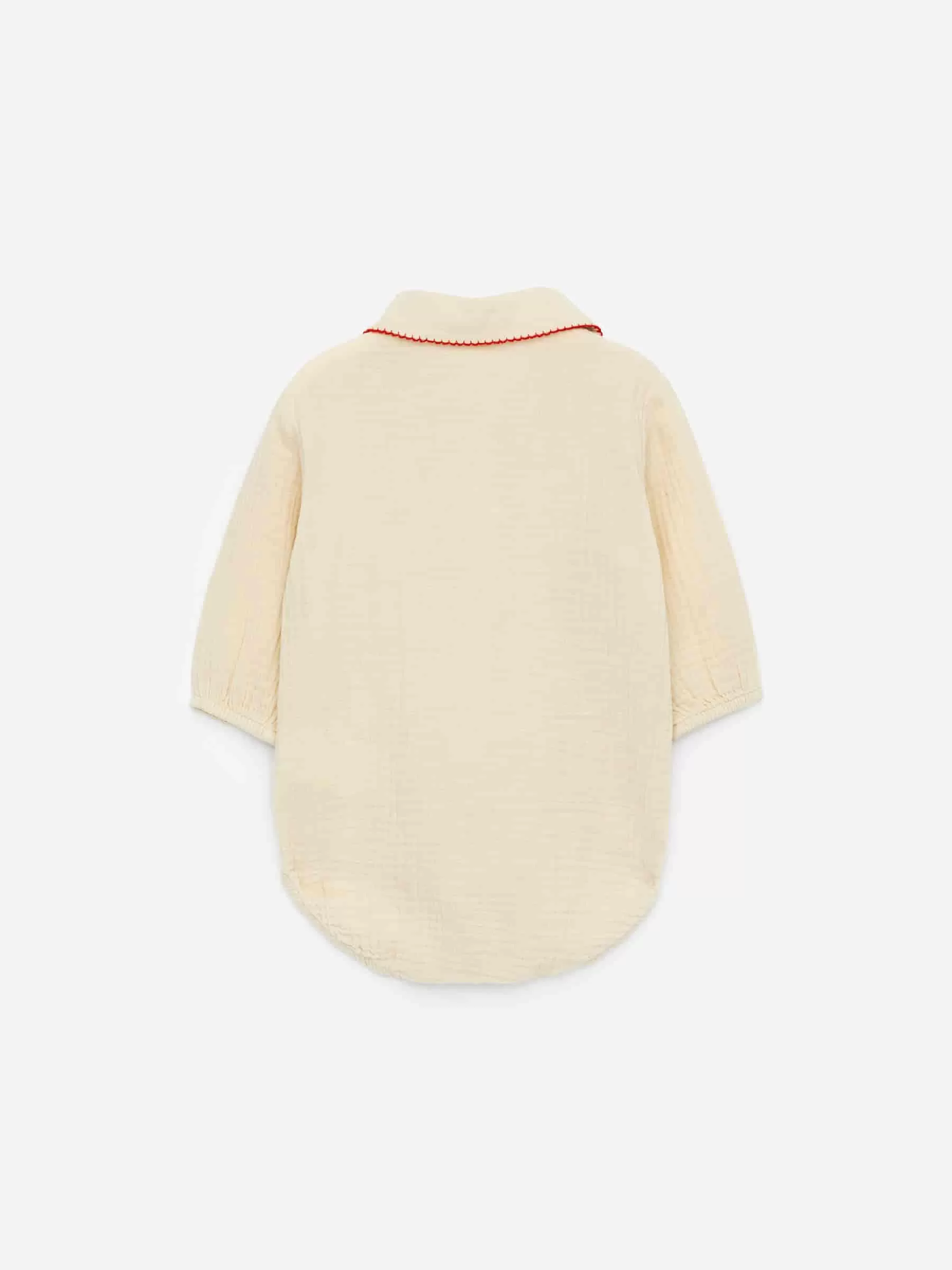 Pelele en suave tejido de muselina de algodón. Diseñado con un cuello redondeado con detalles de punto tipo manta. Botones a presión en la parte delantera y en la entrepierna.