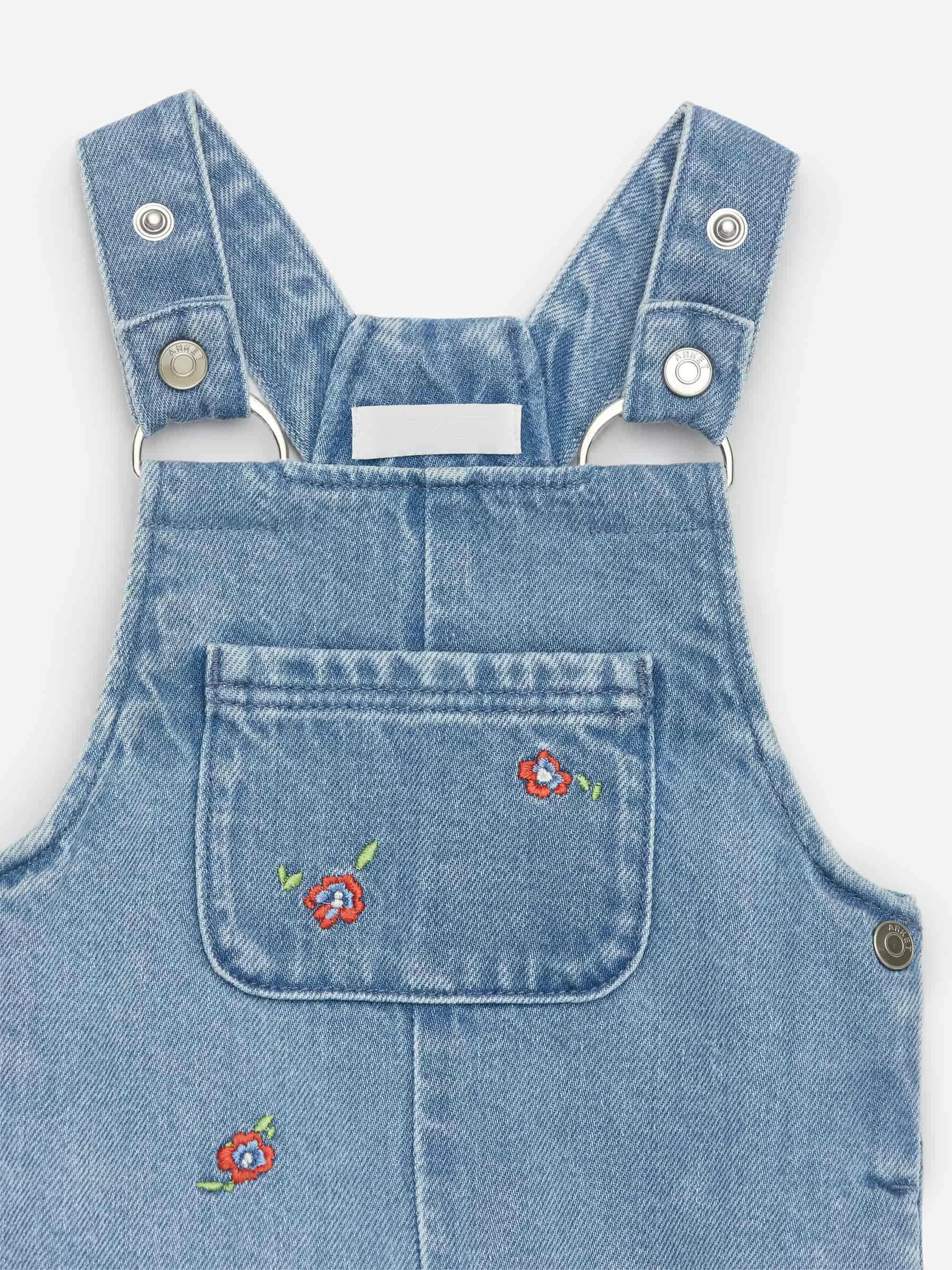 Pantalón peto denim con detalle de bordado. Diseñado con un bolsillo en el pecho, un único bolsillo trasero y botones automáticos en la entrepierna para todas las tallas excepto 86 y 92. Tirantes ajustables.