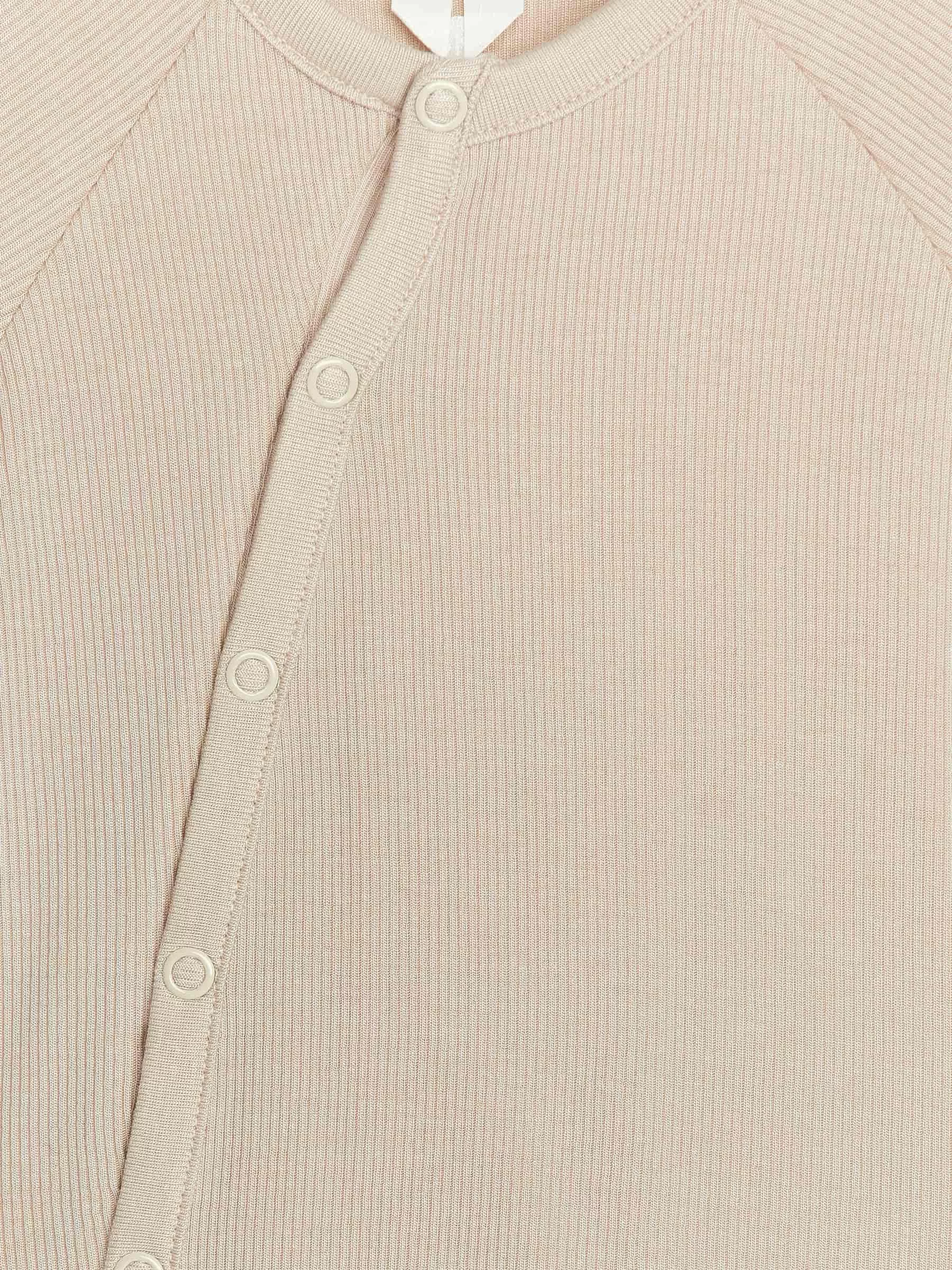 Pijama de manga larga para el bebé recién nacido. Confeccionado con un jersey acanalado ultrasuave y ligero hecho de lyocell y elastano para mayor elasticidad. Los puños son plegables sobre manos y pies. Botones a presión en la parte delantera, colocados en diagonal para vestirse y cambiarse fácilmente.