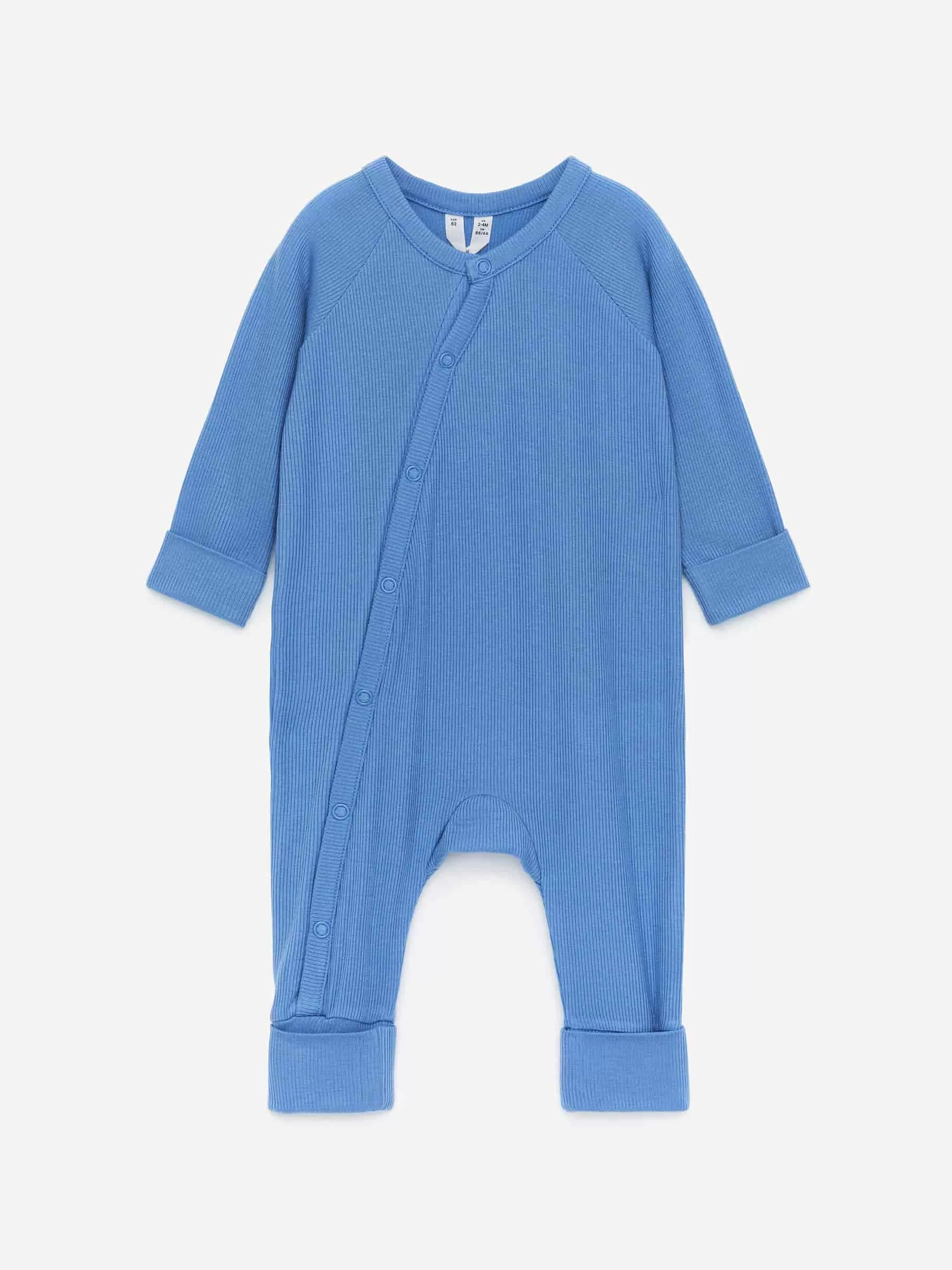 Pijama de manga larga para el bebé recién nacido. Confeccionado con un jersey acanalado ultrasuave y ligero hecho de lyocell y elastano para mayor elasticidad. Los puños son plegables sobre manos y pies. Botones a presión en la parte delantera, colocados en diagonal para vestirse y cambiarse fácilmente.