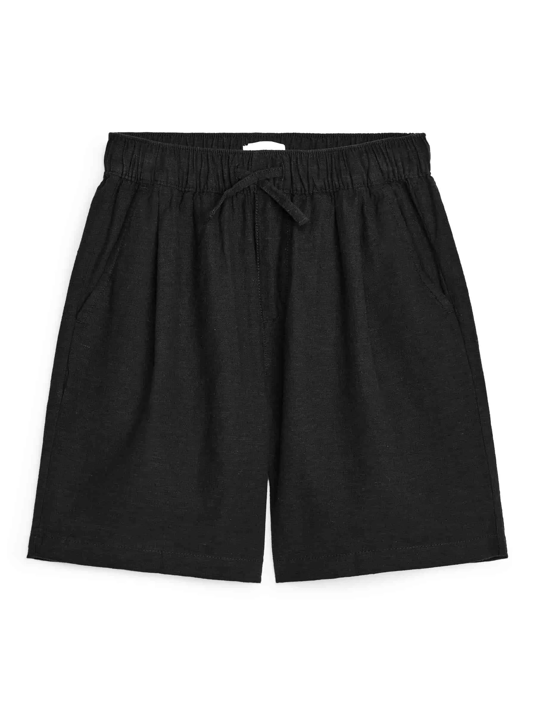 Shorts en tejido táctil de mezcla de lino y algodón. Una cintura elástica con cordón permite un ajuste cómodo y ajustable. Bolsillos en costuras laterales.