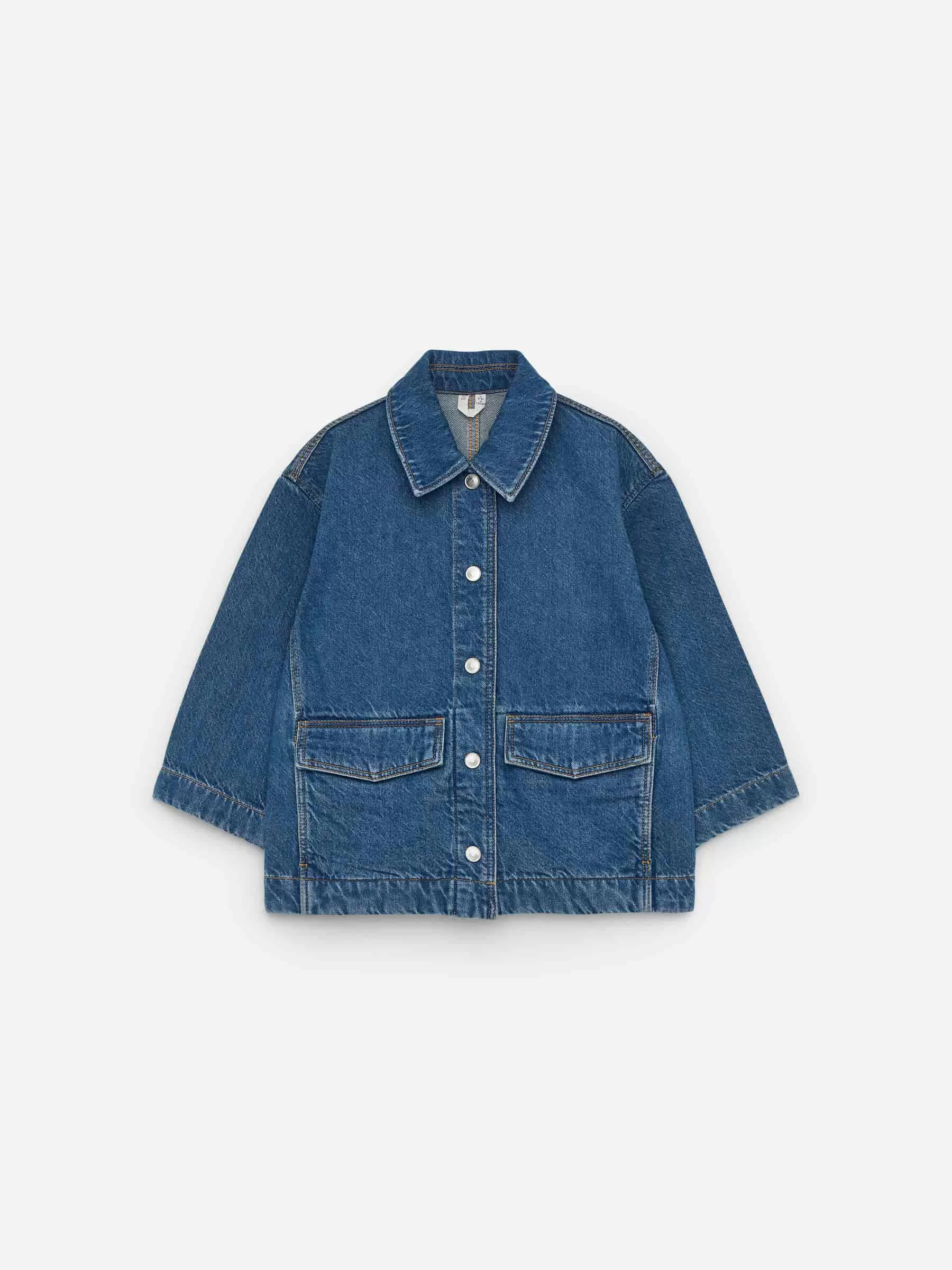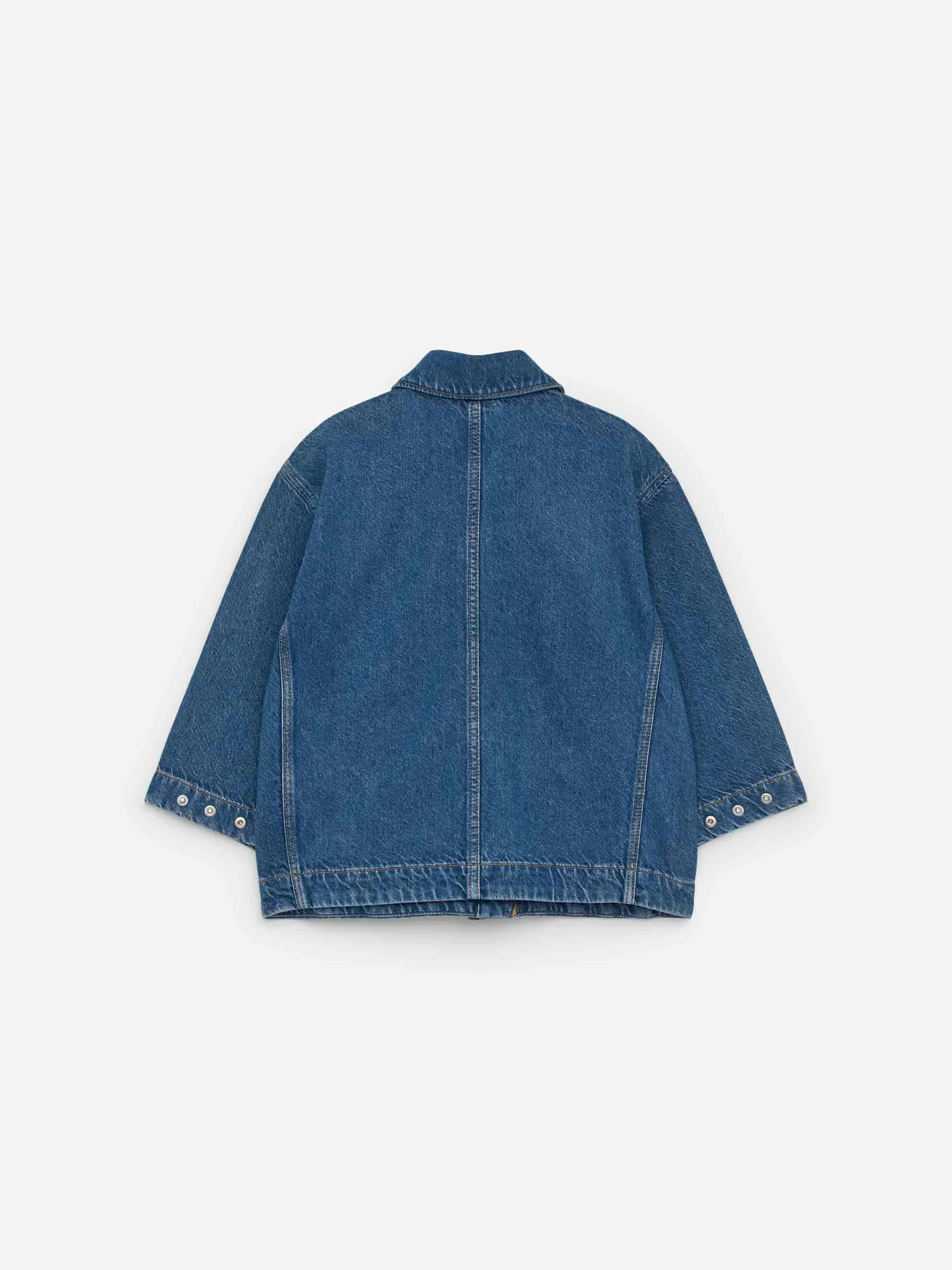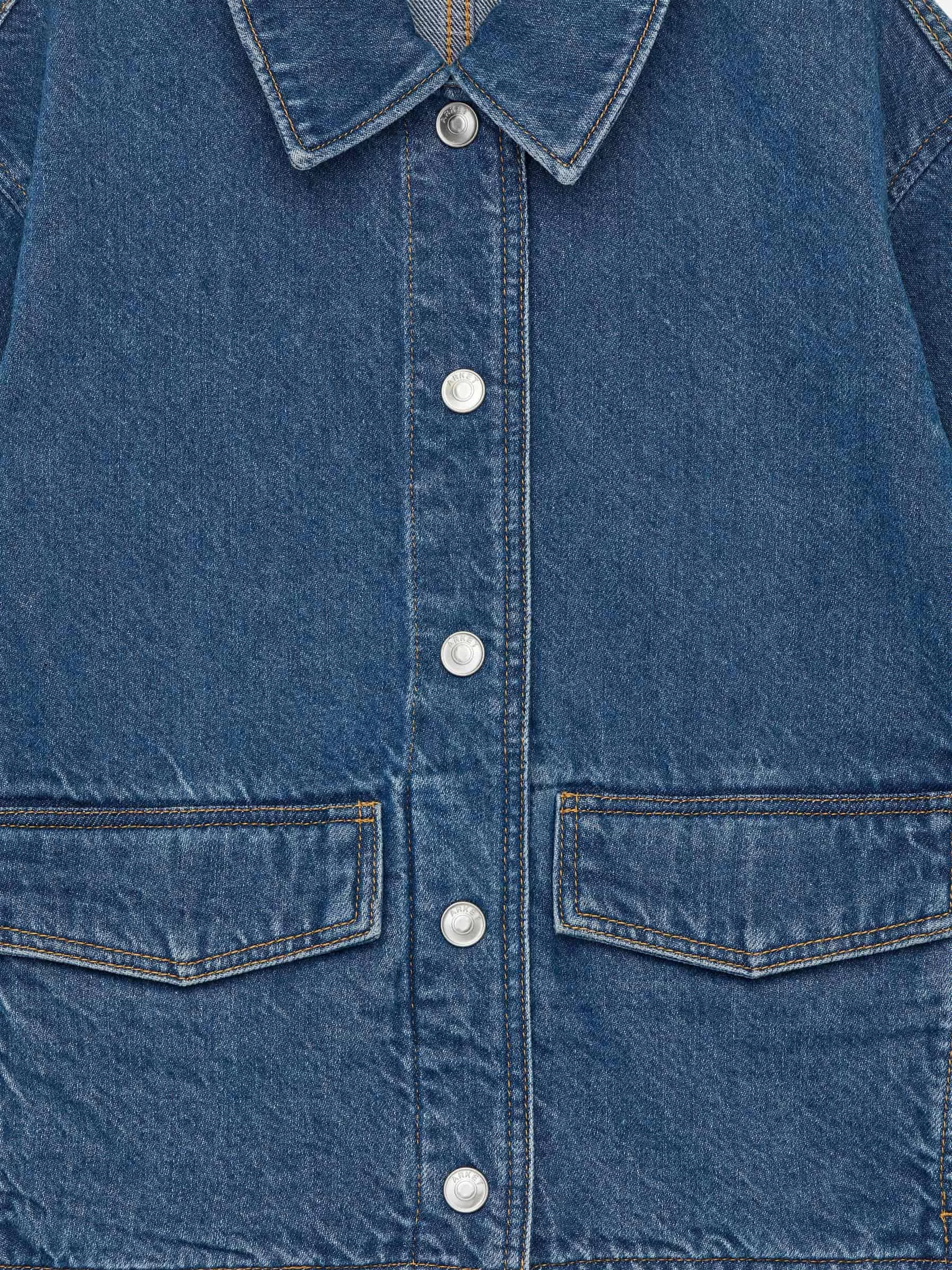 Sobrecamisa denim con hombros caídos, bolsillos delanteros y cierre frontal con botones.