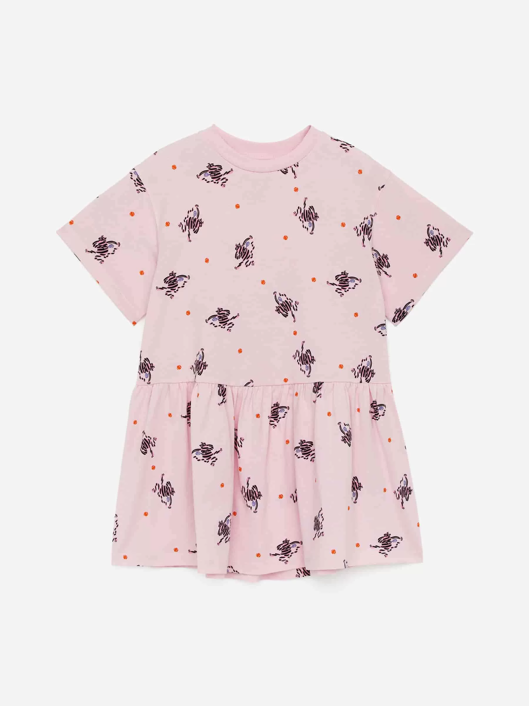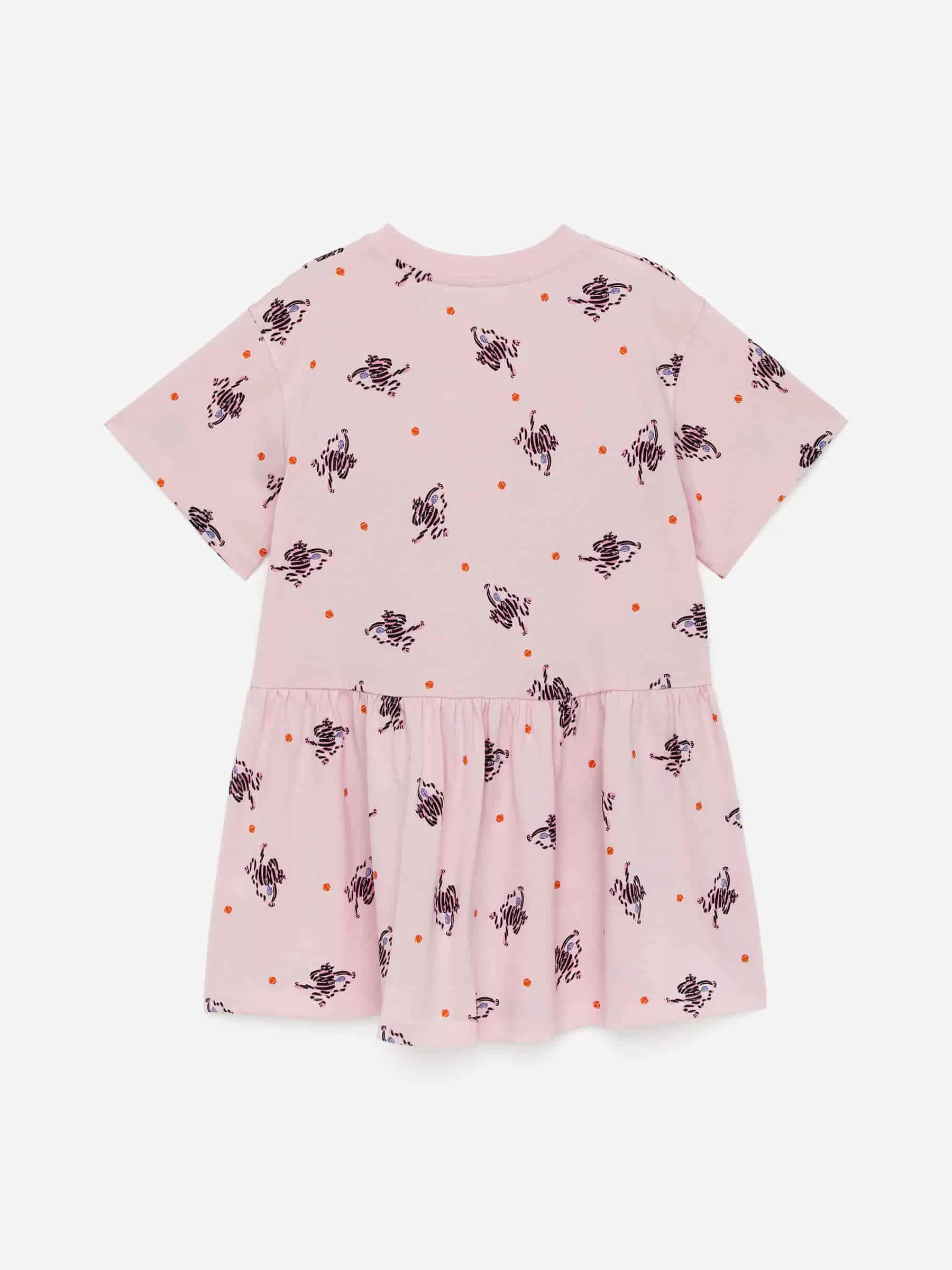 Vestido de manga corta con volantes confeccionado en un suave punto de algodón. Corte para un ajuste relajado con ribete acanalado en el escote y fruncidos en la cintura.