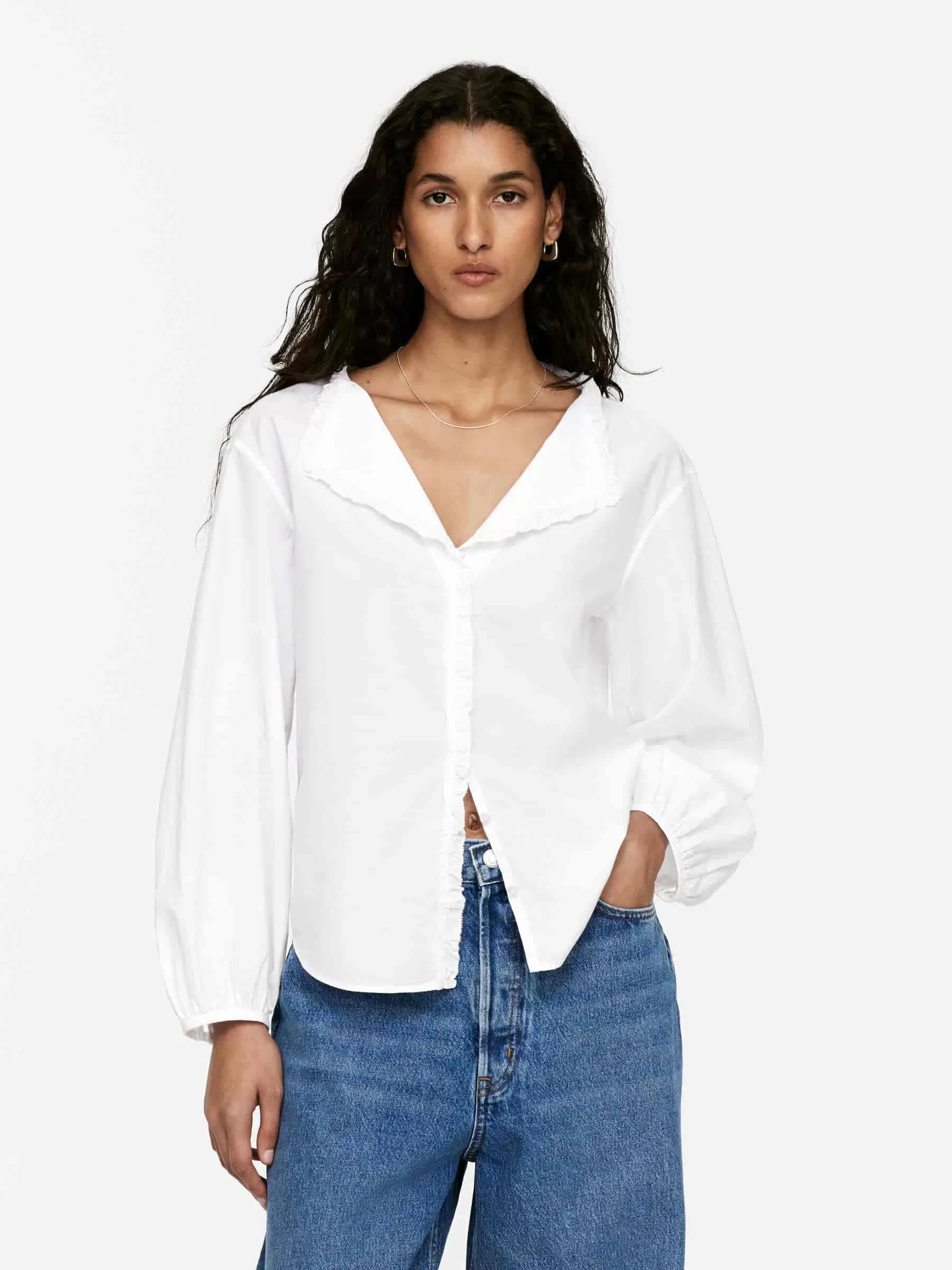 Blusa de manga larga confeccionada en algodón. Diseñado con volantes en la parte delantera, cierre de botones y fruncidos en los puños. Ajuste regular.