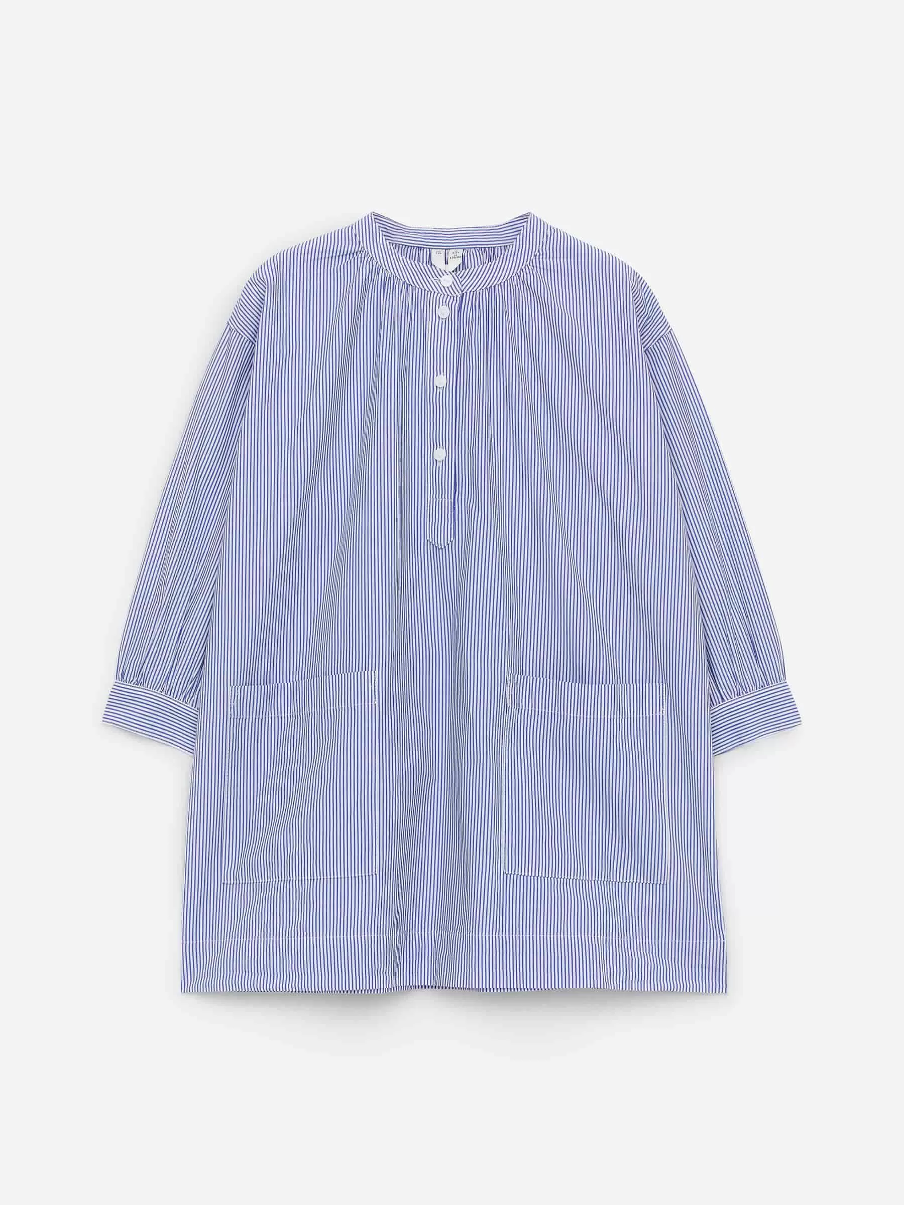 Vestido de algodón con frunces en cuello y hombros caídos. Media tapeta abotonada y bolsillos de parche. Terminaciones de mangas con puños abotonados.